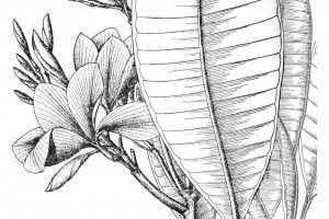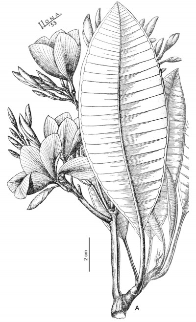 Observaciones: Nombres vulgares y usos. “Frangipani”, “jazmín magno”, “jazmín mango”. Cultivada como ornamental por sus abundantes y llamativas flores perfumadas; también se le atribuyen propiedades medicinales.