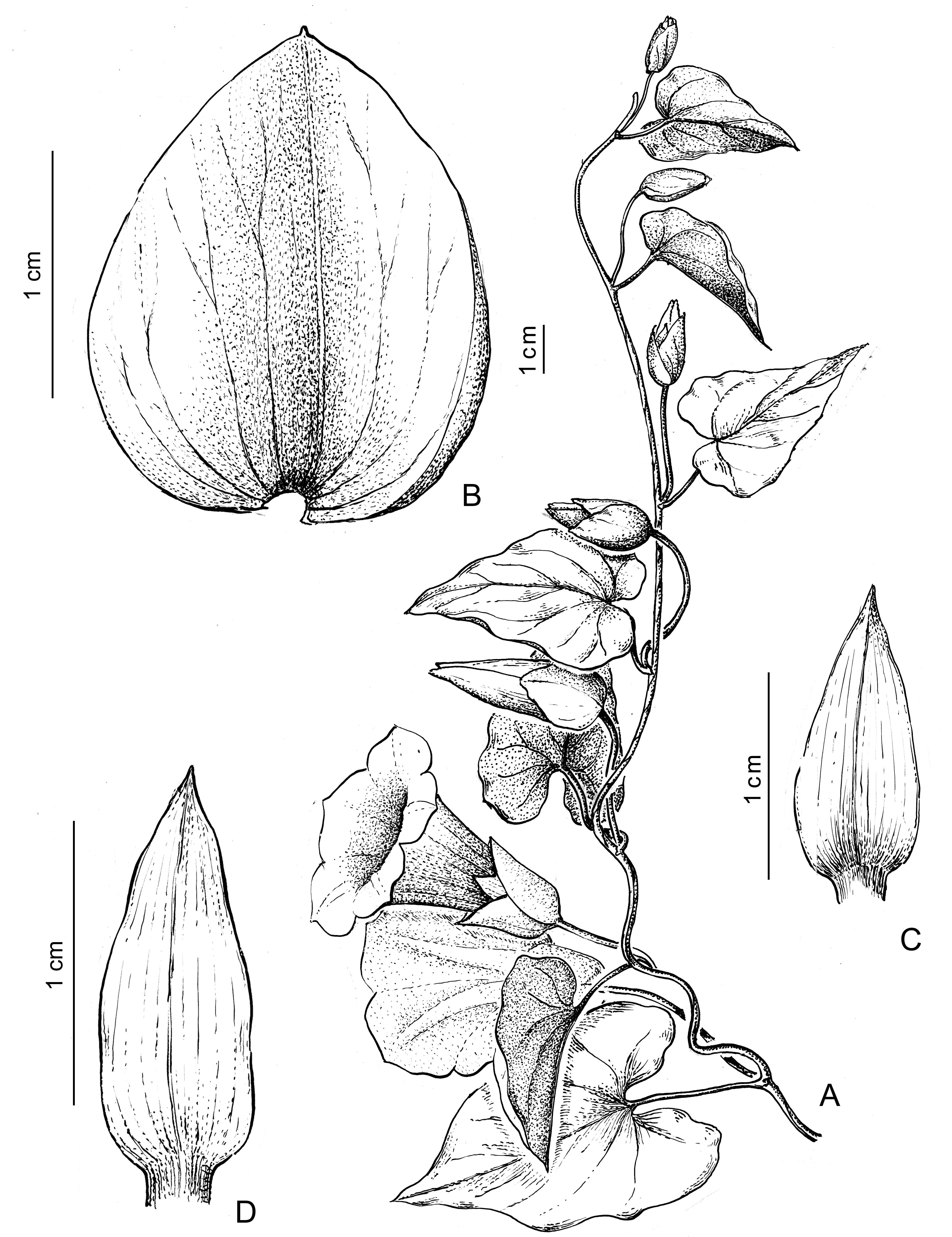 Plantas herbáceas, volubles, rizomatosas; tallos estriados, algo pubescentes o glabros, apéndices estipuliformes ovados, caedizos, hasta de 0,5 mm largo. Hojas ovado-sagitadas, lanceolado-sagitadas o hastadas, de 1,5-10 × 2-15 cm, glabras o algo pilosas, lóbulos redondeados o 2-3-dentados, ápice agudo. Flores con brácteas del epicáliz ovadas, de 9-16 × 16-24 mm, verdes o con los bordes rojizos, base sacciforme; sépalos membranáceos, glabros, apiculados, ciliados en la parte superior, los exteriores ca. 14 × 5,5 mm, elípticos a ovados, los interiores ca. 12 × 5 mm, ovados a ovado-lanceolados; corola de 3-5,5 cm de largo, blanca, campanulada, pubescente en los extremos de las interplicae; estambres ca. 22 mm de largo; estilo ca. 3 cm de largo, con los lóbulos elipsoidales, papilosos. Cápsulas subglobosas, de 1-1,3 cm de diámetro. Semillas de 4,5-5 mm de largo, negras, glabras. Subsp. sepium.- Corola blanca.