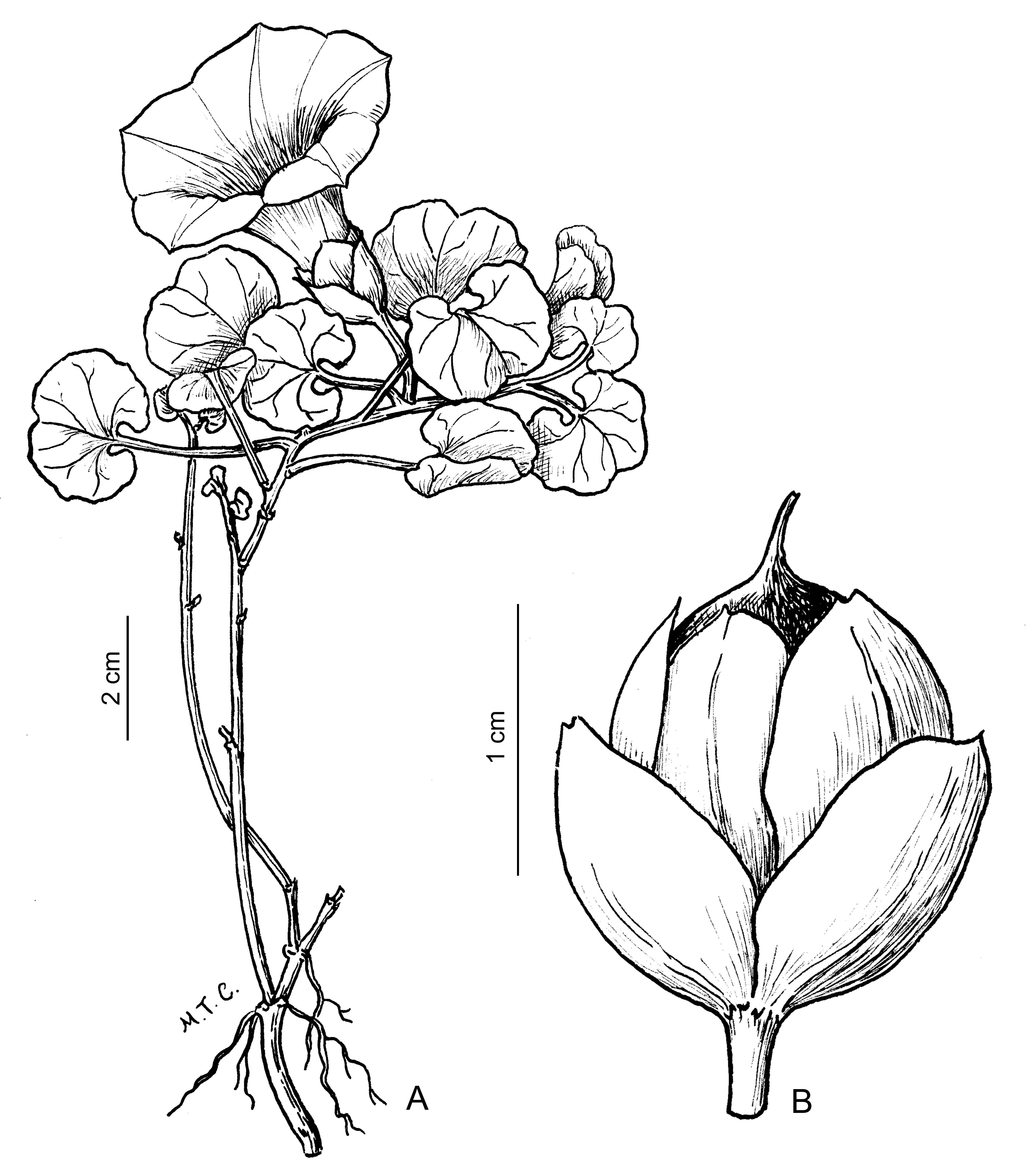 Plantas perennes, con rizoma de 3-5 mm de diámetro, enterrado en profundidad; tallos rastreros, radicantes, cilíndricos, rojizos, glabros. Hojas pecioladas, glabérrimas, carnosas, reniformes, de 0,7-2,6 × 0,8-4 cm, enteras o algo sinuadas, mucronadas, a veces emarginadas. Pedúnculos de 1,5-10 cm de largo. Flores con brácteas florales suborbiculares, ca. 9 × 10,5 mm, obtusas, truncadas o emarginadas, nervaduras rojizas; sépalos subiguales, oblongos a ovados, obtusos, a veces emarginados, mucronados, los exteriores ca. 10 × 7,5 mm, los interiores ca. 9,5 × 5.5 mm; corola rosada, ca. 3,5 cm de largo, glabra, borde 5-lobulado; estambres subiguales, de 19-20 mm de largo; gineceo con estilo de 15-17 mm de largo. Cápsulas de 10-15 mm de diámetro, generalmente hipógeas, acompañadas por sépalos y brácteas florales ampliados. Semillas de 5-6 mm de largo, finamente punteadas.