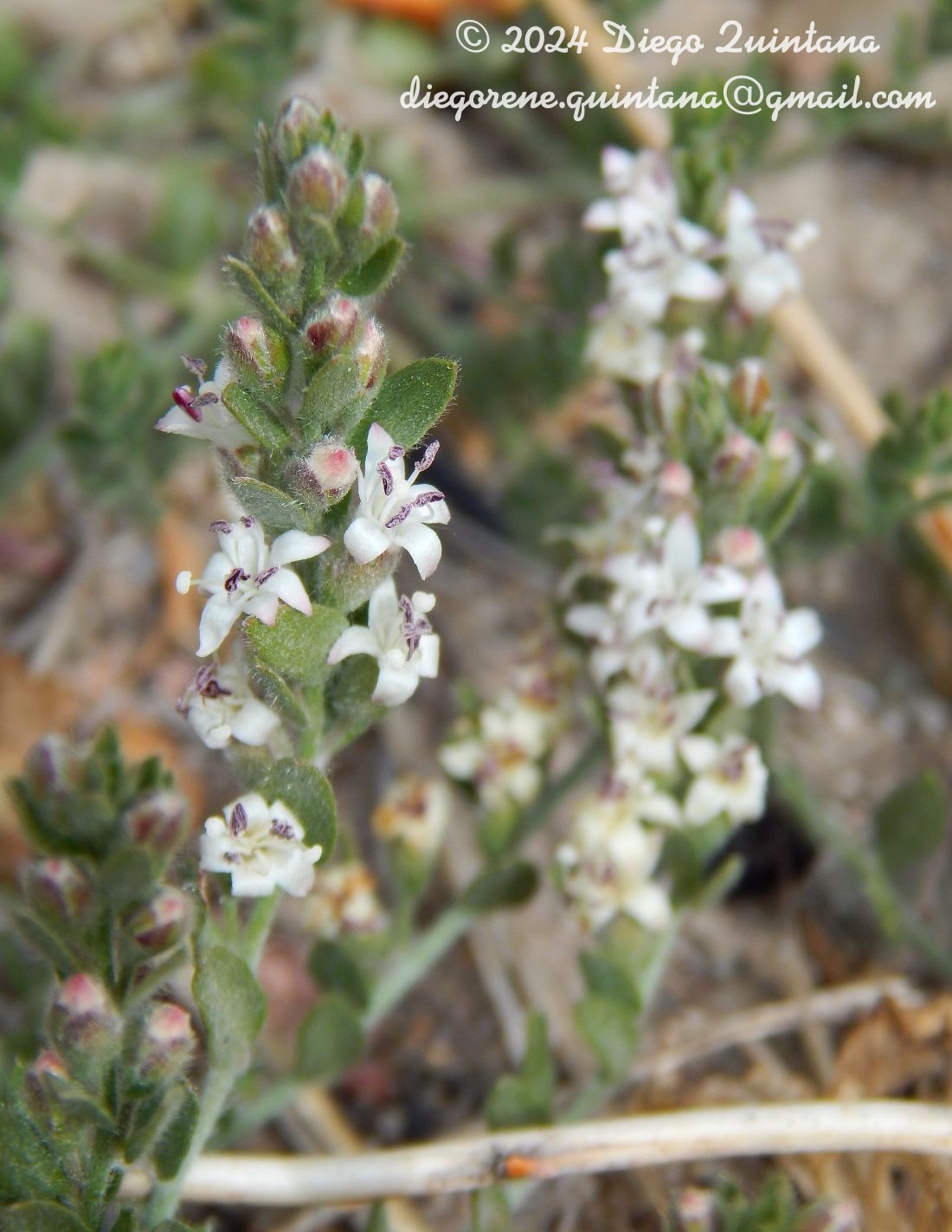 Hierbas erectas, ramificadas, de 5-35 cm de alto, cubiertas de pelos malpighiáceos. Hojas pecioladas, lanceoladas o elípticas, de 3-12 × 1,5-4 mm, subcarnosas, pubescentes. Flores solitarias en las axilas de las hojas superiores, cortamente pedunculadas; sépalos subiguales, oblongo-ovados, seríceopubescentes, de 2,5-3,5 × 1,5-2 mm; corola blanca, hipocrateriforme, ca. 6 mm de largo, con tubo apenas más largo que los lóbulos; androceo con estambres ca. 5,5 mm de largo; ovario ovoideo, piloso en el ápice; estilos de 3,5-5 mm de largo; estigmas capitados, lisos. Cápsula de 6 mm, 1-seminada, pubescente en el ápice. Semillas de 3,5-4 × 2,5-3 mm, castañas.