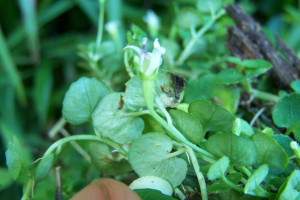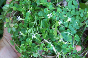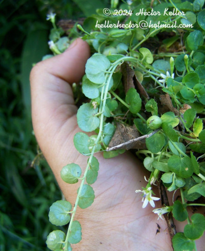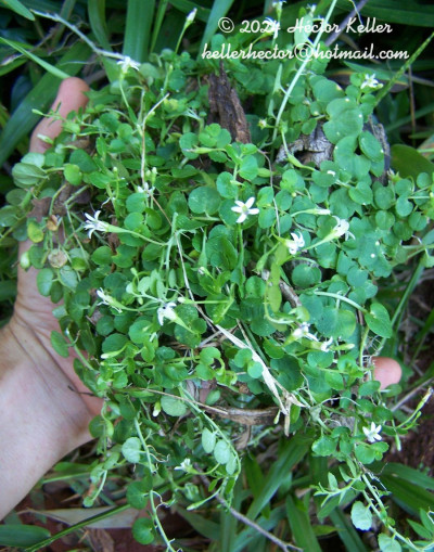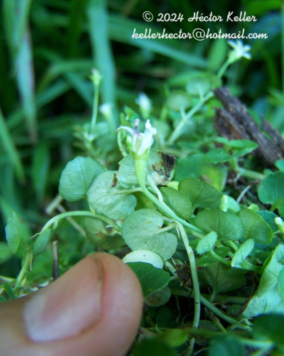 Hierbas rastreras, latescentes, con tallos ca. 1 mm de diámetro, pilosos a glabrescentes, radicantes en los nudos; entrenudos hasta de 1,1 cm de largo. Hojas alternas, pecíolos de 1-8,5 mm de largo, pilosos; láminas suborbiculares a reniformes, de 3,5-10 × 3,5-12 mm, base cordada, borde entero a ondulado, membranáceas, glabras, excepto por pelos cortos y gruesos situados en el margen. Flores axilares y terminales; pedúnculos pilosos hasta de 2 cm de largo, con bractéolas opuestas cerca de la base, triangulares a lineares, enteras o 3-ífidas, hasta de 1 mm de largo; hipanto turbinado, costulado, piloso, ca. 2 mm de largo; lóbulos calicinos angostamente triangulares a lanceolados, enteros o dentados, de 1-1,5 mm de largo; corola blanca a blancoazulada, bilabiada, de 5 mm de largo, externamente glabra e internamente pilosa; tubo de 3 mm de largo; lóbulos lanceolados, desiguales en tamaño; estambres soldados en el tercio superior, filamentos ca. 3 mm de largo, anteras de 1 mm de largo. Fruto 2locular, obovoide, hasta de 1 × 0,6 cm, multiseminado; con frecuencia dehiscente por una ruptura irregular. Semillas aplanado-ovoides, ca. 8 × 4 mm; superficie finamente foveolada, lustrosa, de color castaño pálido; hilo negro.