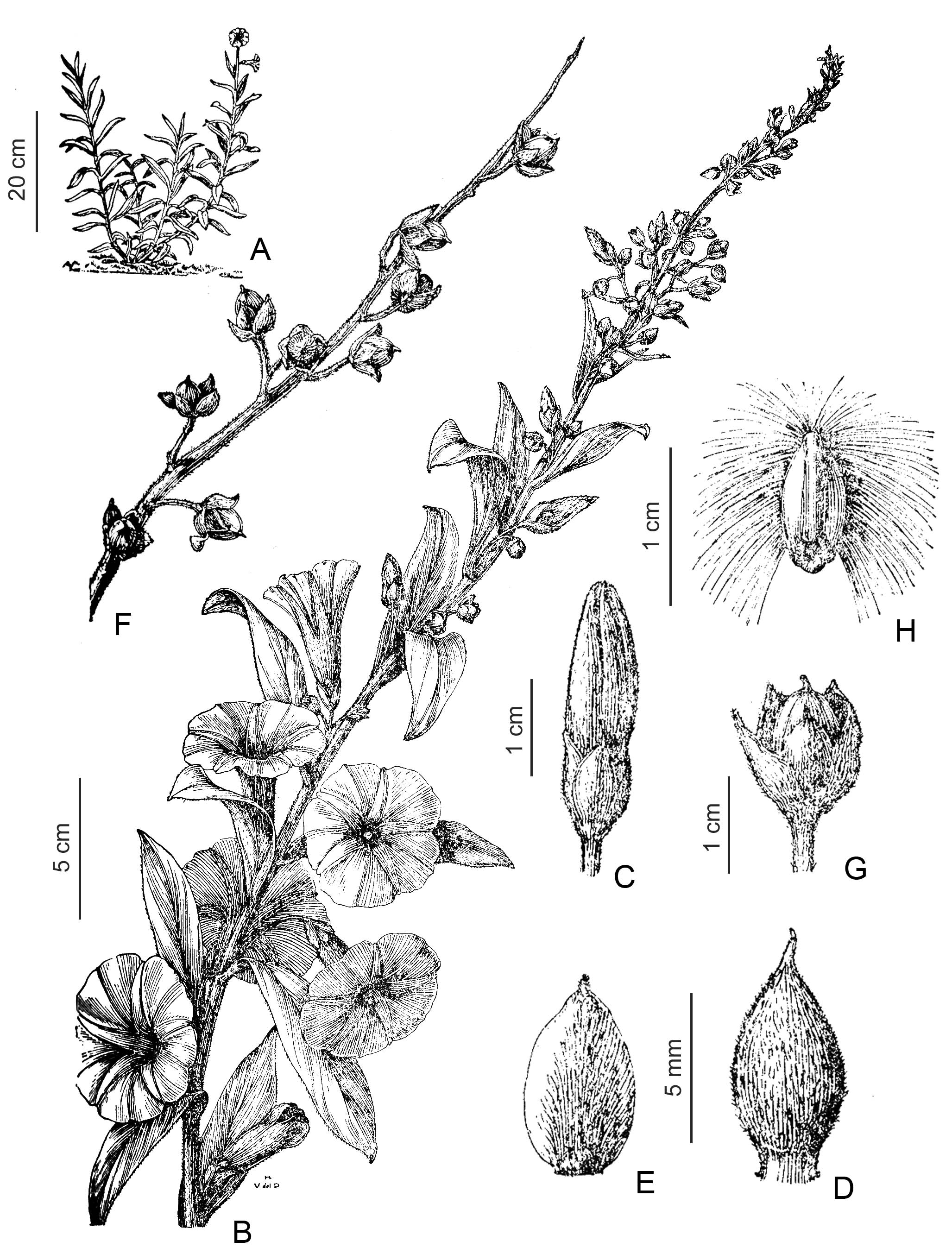 A. Aspecto de la planta (muy reducido). B. Rama en flor. C. Botón floral. D. Sépalo externo. E. Sépalo interno. F. Rama con frutos. G. Fruto. H. Semilla. Tomado de Lilloa 29: 213, fig. 30. 1959