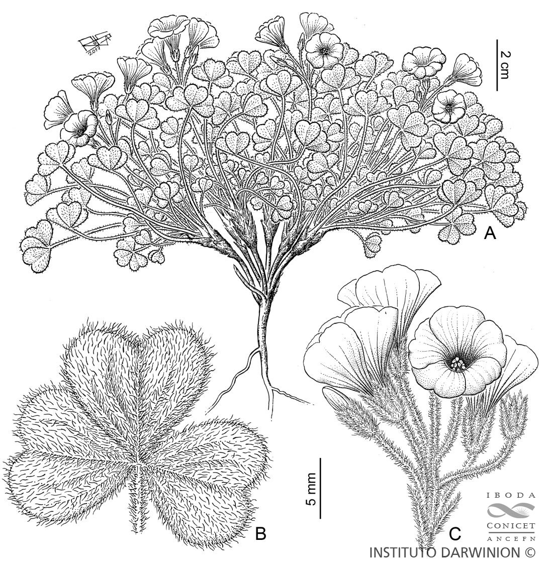 Hierbas caulescentes, perennes, de 5-15 cm de alto, formando cojines laxos, con pubescencia de color azulado. Raíces largas y profundas. Tallos leñosos, ramificados desde la base. Hojas numerosas; estípulas soldadas al pecíolo, lineares, enangostadas hacia el ápice, 3-nervadas, pubescentes; pecíolos hirsutopubescentes, base de los pecíolos cubriendo los tallos; folíolos obcordados, emarginados, incisos 1/3-1/8, pubescentes en ambas caras y en el margen, lóbulos redondeados u oblongos; calli no observados. Cimas umbeliformes, 2-9-floras, sobrepasando levemente el follaje; pedúnculos pubescentes; pedicelos pubescentes; brácteas lineares, angostas; bractéolas lineares, angostas. Flores hasta de 12-15 mm de diámetro; sépalos ovados, ápice redondeado, pubescentes, calli no observados; pétalos 2 veces el largo de los sépalos, amarillos, con marcada venación violeta. Cápsulas globosas, con el cáliz acrescente y sobrepasando 1/3 el fruto. Semillas redondeadas, pardas, con estrías curvas, leves e irregulares.