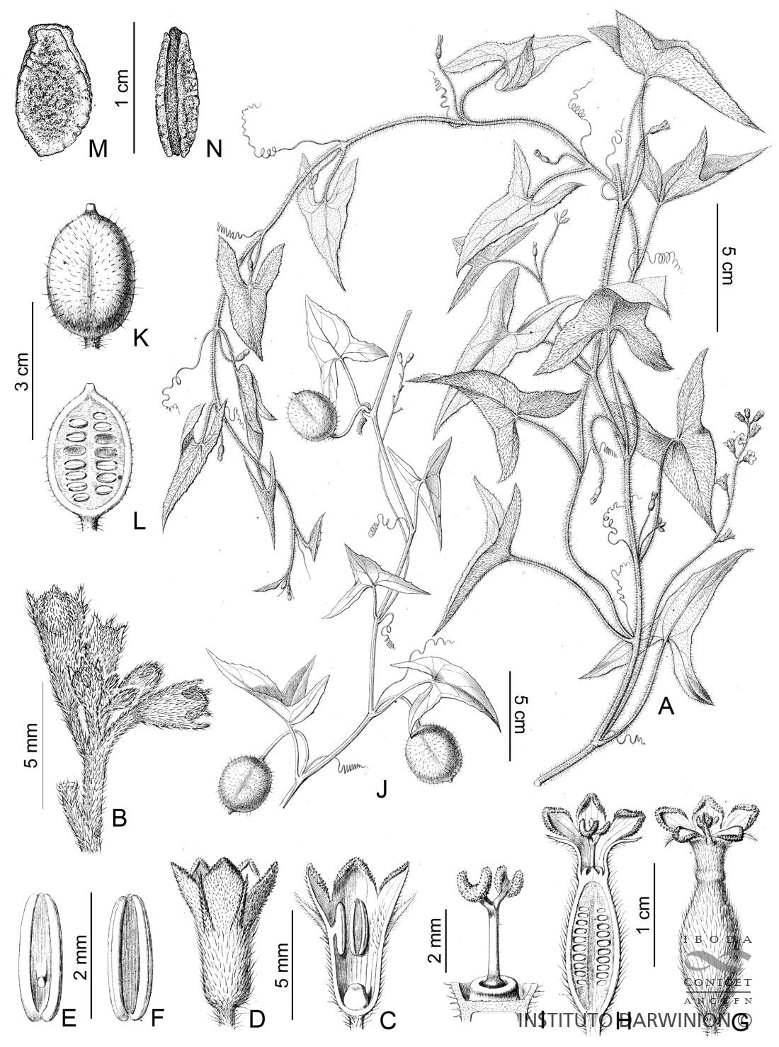 Hemicriptófitos zarcillosos diclinomonoicos. Hojas simples; pecíolo de 10-24 mm; lámina sagitado-hastada, 3-lobadas (lóbulo medio de 18-30 × 8-19 mm, lóbulos basales de 12-24 × 4-10 mm), lóbulos enteros o disectos. Zarcillos simples. Monocasios estaminados ebracteados, 6-12-floros, pedúnculos de 33-55 mm; pedicelos de 1,5-2 mm, persistentes. Flores estaminadas con hipanto tubular, de 2-4 × 2 mm, garganta con pubescencia densa, algodonosa; sépalos subulados, de 1,5 × 0,75 mm; corola amarilloverdosa, con prefloración imbricada en la base e induplicada en el ápice, pétalos oblongos, de 2-3 × 2-3 mm, papilosos en el envés; filamentos estaminales de 0,4 mm, anteras oblongas, de 2-2,2 × 0.25 (monotécica) - 0,5 (ditécica) mm, pistilodio hemisférico, pequeño; nectario formado por la base engrosada del hipanto. Flores carpeladas solitarias; pedicelos de 3-14 mm; hipanto y perianto como en la flor estaminada; gineceo 2-carpelar; ovario de 6 × 1,5 mm; estilo de 3 mm; estigmas con 2 ramas 2-sectas, segmentos lineares, papilosos; nectario cupuliforme alrededor de la base del estilo; estaminodios 3, escuamiformes, setiformes o foliosos, a veces ausentes. Bayas ovoideas, levemente comprimidas, de 20-25 × 17-19 mm, amarillentas, con algunas emergencias espiniformes blandas en su superficie; pedicelos de 10-30 mm. Semillas ovoideas, comprimidas, levemente marginadas, de 7-8 × 4-4,5 × 1,5-2 mm; testa con margen liso, castaño y superficie con excrescencias esponjosas, blanquecinas.