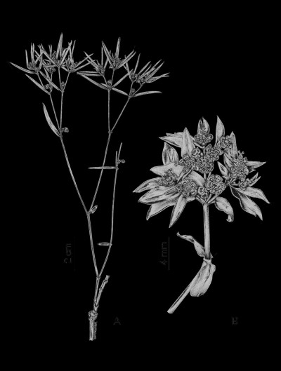 Hierbas glabras, erguidas, de 20-40 cm de alto; tallos con entrenudos de 2,5-12 cm de largo. Hojas opuestas o verticiladas, sésiles; láminas angostamente elípticas, de 8-20 × 0,4-2 mm, mucronadas, el margen entero; estípulas triangulares, laciniadas. Ciatios dispuestos en pseudopleocasios; involucro cupuliforme, de 1-1,2 × 1,3-1,5 mm; lóbulos triangulares, ligeramente laciniados; nectarios 4, redondeados, cortamente pedunculados con apéndices petaloides. Flores estaminadas 20-25; bractéolas laminares, laciniadas. Flores pistiladas con rodete periántico; ovario glabro, estilos cortos y gruesos, 2-fidos en la mitad distal. Fruto una cápsula ovoide, de 1,4-2 × 1,2-1,8 mm. Semillas ovoides, de 1,2-1,5 × 1-1,2 mm, suavemente rugosas o punteadas.
