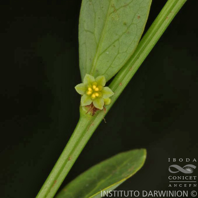 Arbustitos de 0,5-1 m de alto, glabros; tallos leñosos, cilíndricos, generalmente ramificados; ramitas comprimidas, delgadas. Hojas dísticas; pecíolos ca. 0,5 mm de largo; láminas elípticas a lanceoladas, de 4-10 × 9-30 mm, agudas u obtusas, enteras, marginadas, discoloras; estípulas ovado-lanceoladas, escariosas, de 2-3 mm de largo. Inflorescencias estaminadas fasciculadas, las pistiladas subsolitarias; pedúnculos ca. 2 mm de largo. Flores estaminadas con 5-6 sépalos más o menos soldados, elípticos, ca. 1,5 mm de largo, 1-nervados; estambres 3, filamentos libres, anteras horizontales, con dehiscencia longitudinal; glándulas 6, libres, cuneadas (trapeciformes). Flores pistiladas con 5-6 sépalos elípticos, ca. 2 mm de largo, soldados en la base; disco angular 6-10-lobulado; ovario subgloboso, 6-lobulado; estilos 3, soldados en la base, 2- lobados, erectos; estigmas lisos. Cápsulas deprimidas, ca. 3 mm de diámetro, 6-lobuladas, pardas, lisas. Semillas finamente puncticuladas.