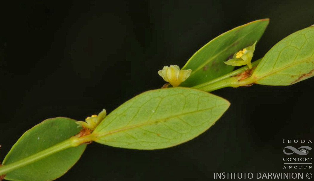Arbustitos de 0,5-1 m de alto, glabros; tallos leñosos, cilíndricos, generalmente ramificados; ramitas comprimidas, delgadas. Hojas dísticas; pecíolos ca. 0,5 mm de largo; láminas elípticas a lanceoladas, de 4-10 × 9-30 mm, agudas u obtusas, enteras, marginadas, discoloras; estípulas ovado-lanceoladas, escariosas, de 2-3 mm de largo. Inflorescencias estaminadas fasciculadas, las pistiladas subsolitarias; pedúnculos ca. 2 mm de largo. Flores estaminadas con 5-6 sépalos más o menos soldados, elípticos, ca. 1,5 mm de largo, 1-nervados; estambres 3, filamentos libres, anteras horizontales, con dehiscencia longitudinal; glándulas 6, libres, cuneadas (trapeciformes). Flores pistiladas con 5-6 sépalos elípticos, ca. 2 mm de largo, soldados en la base; disco angular 6-10-lobulado; ovario subgloboso, 6-lobulado; estilos 3, soldados en la base, 2- lobados, erectos; estigmas lisos. Cápsulas deprimidas, ca. 3 mm de diámetro, 6-lobuladas, pardas, lisas. Semillas finamente puncticuladas.