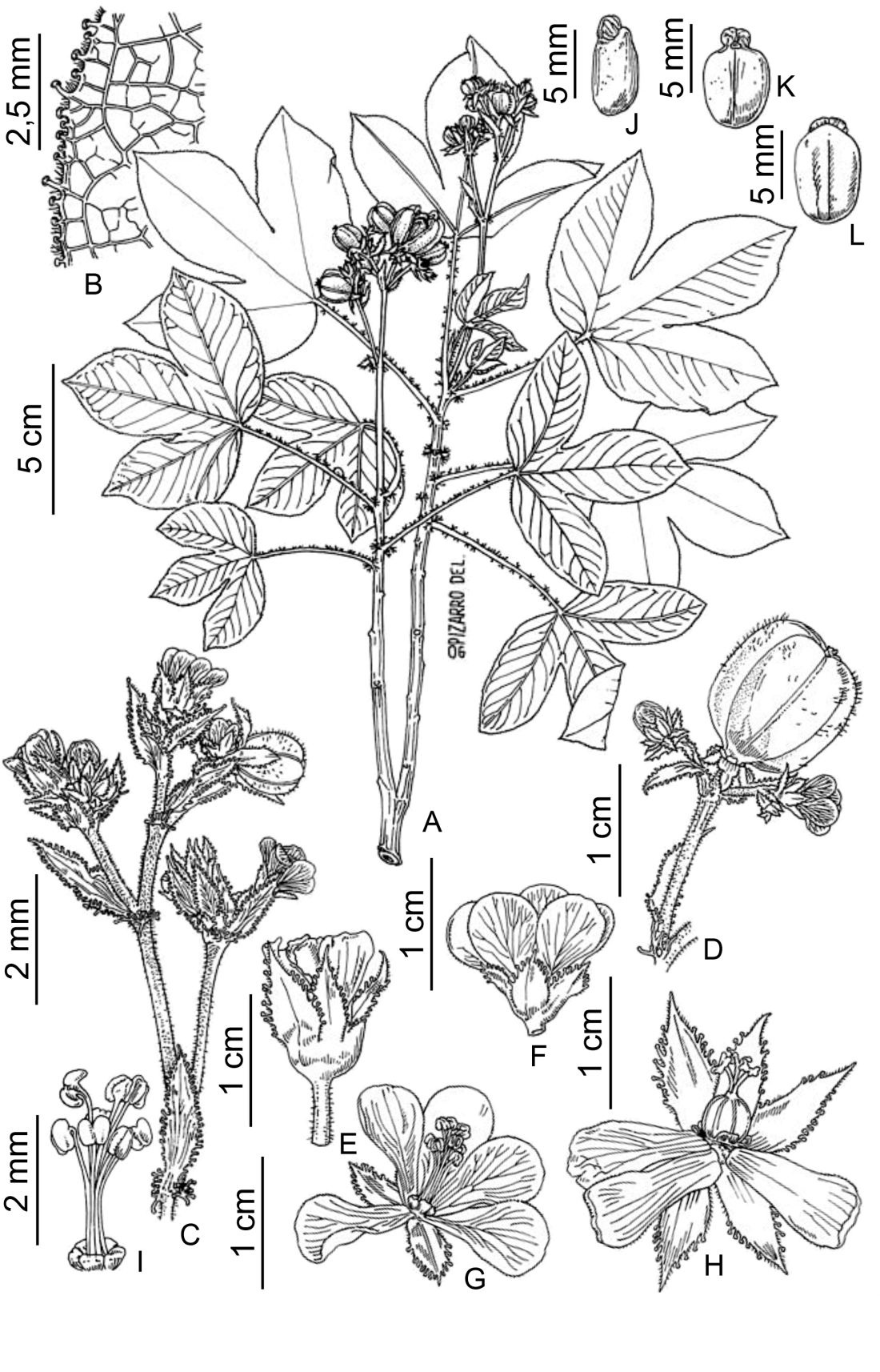 A. Ápice de una rama. B. Detalle de la venación foliar, superficie abaxial, con pelos glandulares en el margen. C. Detalle de inflorescencia. D. Infrutescencia con fruto maduro. F. Flor estaminada. G. Flor estaminada, mostrado el androceo. H. Flor pistilada, mostrando el gineceo. I. Androceo y disco. J. Semilla, vista lateral. K. Semilla, vista hilar. L. Semilla, vista dorsal. Tomado de Blumea 62(1): fig. 3. 2017.