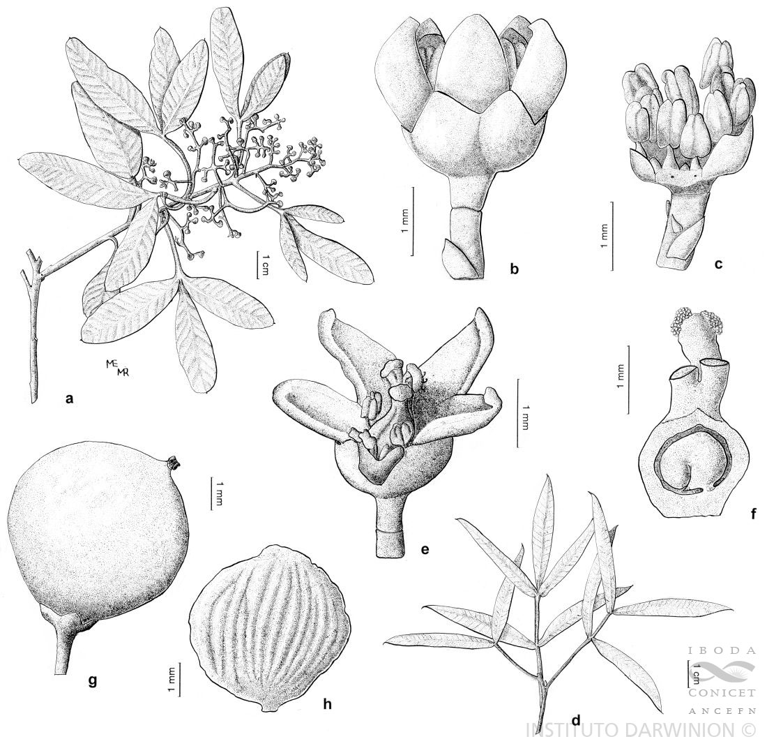 ya que no se ha localizado el material original ligado a este nombre. El único autor que consideró R. commersonii como posible sinónimo fue Engler (1883: 346), quien indicó “? Rhus commersonii”. Dado que no se pudo acceder al material tipo,se omiten los nombres como sinónimos de Lithraea molleoides. Mientras que Cabrera (1938) considera que se trata de formas de una misma especie, Barkley (1962) distingue tres entidades en función de la forma de losfolíolos: Lithraea ternifolia, Lithraea molleoides y Lithrae