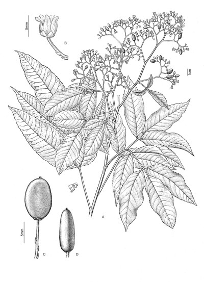 Árboles diclino-monoicos, hasta de 6(-10) m de alto; ramas flexuosas. Hojas pinnadas; pecíolos de 3-7 cm de largo; 3-5 folíolos subsésiles, a excepción del terminal con peciólulo de 0,9-3,5 cm de largo; lámina de losfolíolos angostamente elíptica a ovada, de 5-13,5 × 2-5,2 cm, ápice acuminado, base cuneada, margen entero o algo aserrado, más frecuentemente hacia el ápice, textura cartácea, glabra o con fina pubescencia en la porción basal y pilosidad axilar en la cara abaxial, especialmente en hojas nuevas. Inflorescencias en panículas, hasta de 15 cm de largo, terminales. Flores 5-meras; pedicelos de 1,5-2 mm de largo; cáliz con dientes hasta de 1,2 mm de largo; corola con pétalos ovados, de 2,3-3,2 mm de largo blanco-amarillentos o amarillo-verdosos. Flores pistiladas con ovario subgloboso y estigmas capitados. Drupa de 0,7-0,9 × 3-4,5 mm, verde anaranjada a rojiza.