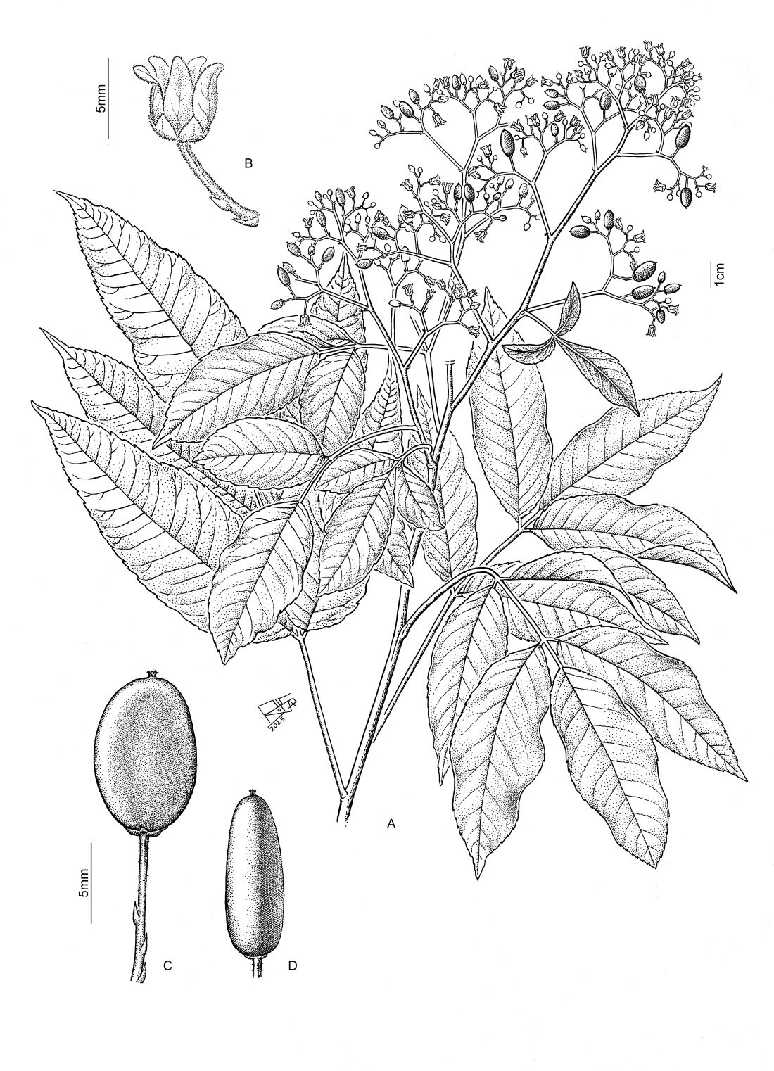 Árboles diclino-monoicos, hasta de 6(-10) m de alto; ramas flexuosas. Hojas pinnadas; pecíolos de 3-7 cm de largo; 3-5 folíolos subsésiles, a excepción del terminal con peciólulo de 0,9-3,5 cm de largo; lámina de losfolíolos angostamente elíptica a ovada, de 5-13,5 × 2-5,2 cm, ápice acuminado, base cuneada, margen entero o algo aserrado, más frecuentemente hacia el ápice, textura cartácea, glabra o con fina pubescencia en la porción basal y pilosidad axilar en la cara abaxial, especialmente en hojas nuevas. Inflorescencias en panículas, hasta de 15 cm de largo, terminales. Flores 5-meras; pedicelos de 1,5-2 mm de largo; cáliz con dientes hasta de 1,2 mm de largo; corola con pétalos ovados, de 2,3-3,2 mm de largo blanco-amarillentos o amarillo-verdosos. Flores pistiladas con ovario subgloboso y estigmas capitados. Drupa de 0,7-0,9 × 3-4,5 mm, verde anaranjada a rojiza.