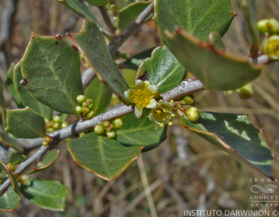 Arbustos muy ramosos, hasta de 3(-6) m de alto, diclinomonoicos; corteza castaña cuando joven, pardo-grisácea a la madurez; ramas espinescentes, divaricadas, glabras. Hojas simples, alternas; pecíolo no alado, de 0,3-1 cm de largo; lámina oblongo-elíptica, en ocasiones elíptica u obovada, de 1,5-5 × 0,5-3 cm, ápice mucronado, en ocasiones redondeado o retuso, base obtusa, margen plano a subrevoluto, entero, en ocasiones algo irregular, glabra en ambas caras, cartácea a subcartácea, venación conspicua. Inflorescencias en pseudoracimos multifloros y congestos, axilares, hasta de 0,7 cm de largo; raquis glabro o ligeramente pubescente con tricomas glandulares sésiles y brácteas isomorfas. Flores 5-meras; pedicelos ca. 3 mm de largo, notoriamente articulados; cáliz con lóbulos ca. 0,5 mm de largo; pétalos ovados, ca. 2 mm de largo, glabros, blancos o blanco-amarillentos. Flores pistiladas con gineceo ca. 1 mm de largo. Drupa de 0,3-0,5 cm de diámetro, lilacina o violácea, glabra.