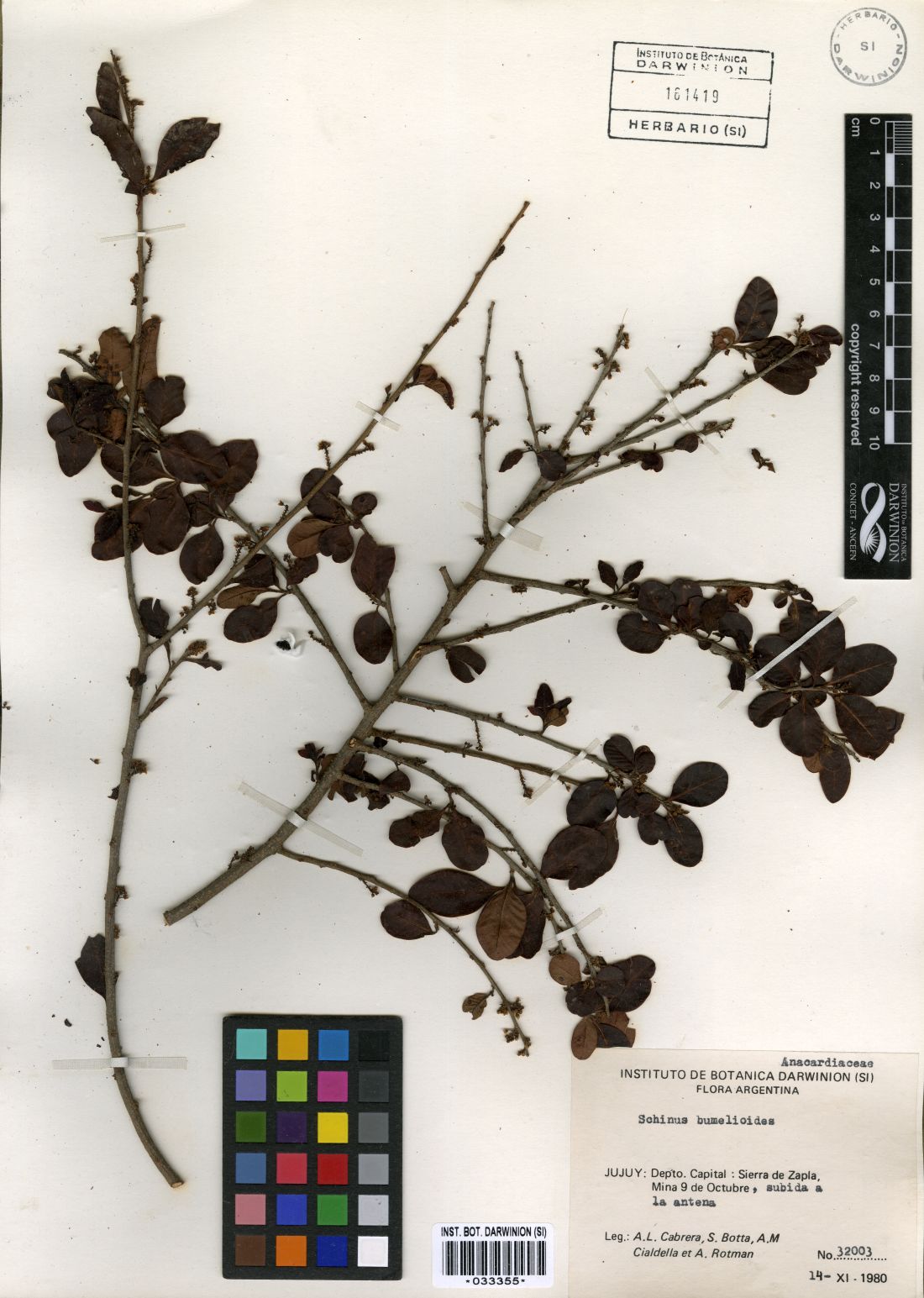Especie endémica del norte y centro de la Argentina. Habita en ambientes áridos, preferentemente en montes o bosques ralos, a alturas que oscilan entre los 300-1615 m s.m. De acuerdo a Barkley (1957), Schinus bumelioides habita en Chaco, Entre Ríos y Santa Fe. No obstante, en las colecciones analizadas no se encontraron materiales de dichas provincias que coincidan con el concepto de la especie tal y como se trata en este estudio; lo más probable es que el material referido por Barkley (1957) pertenezca a S. longifolia.