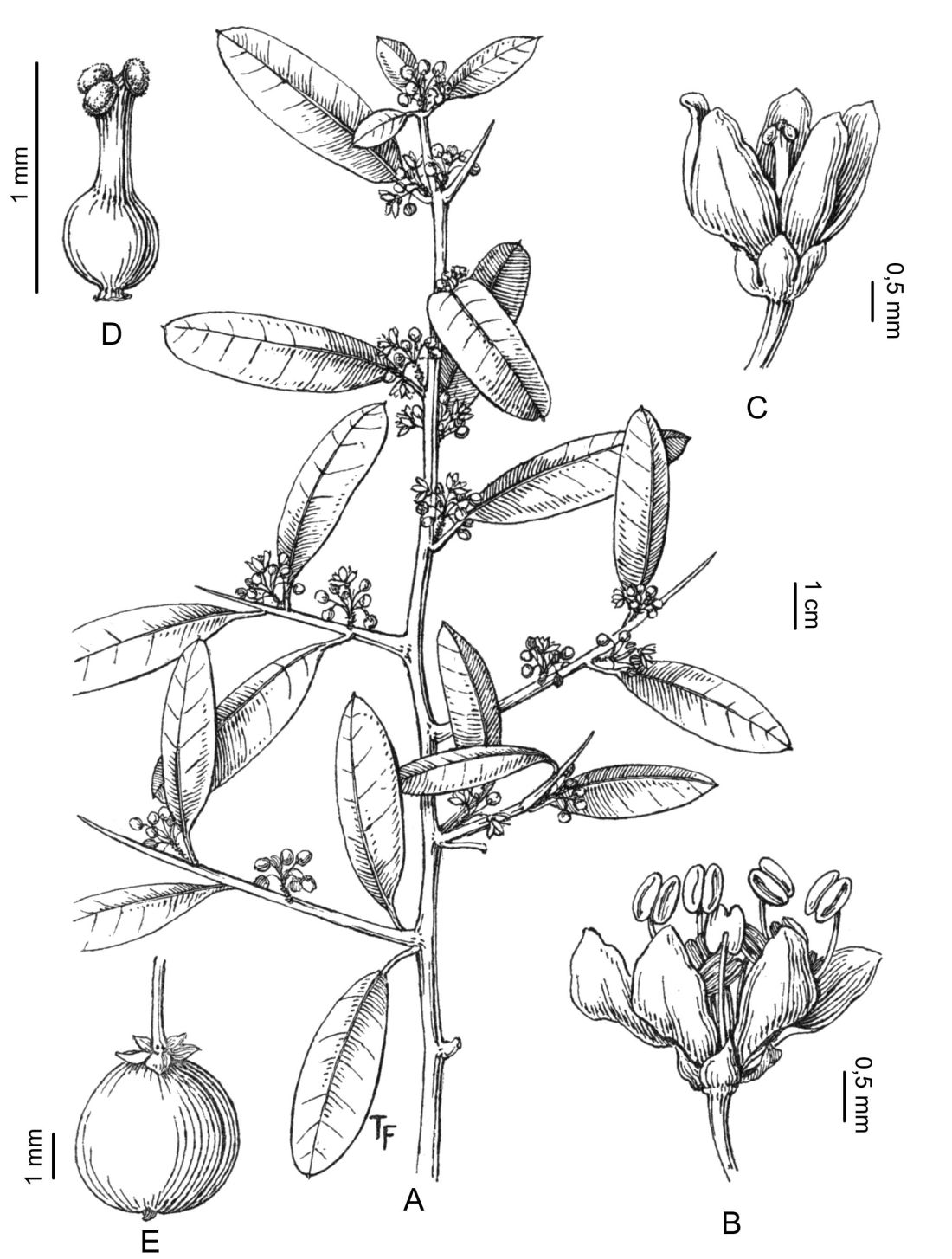 Arbustos muy ramosos, hasta de 3(-6) m de alto, diclinomonoicos; corteza castaña cuando joven, pardo-grisácea a la madurez; ramas espinescentes, divaricadas, glabras. Hojas simples, alternas; pecíolo no alado, de 0,3-1 cm de largo; lámina oblongo-elíptica, en ocasiones elíptica u obovada, de 1,5-5 × 0,5-3 cm, ápice mucronado, en ocasiones redondeado o retuso, base obtusa, margen plano a subrevoluto, entero, en ocasiones algo irregular, glabra en ambas caras, cartácea a subcartácea, venación conspicua. Inflorescencias en pseudoracimos multifloros y congestos, axilares, hasta de 0,7 cm de largo; raquis glabro o ligeramente pubescente con tricomas glandulares sésiles y brácteas isomorfas. Flores 5-meras; pedicelos ca. 3 mm de largo, notoriamente articulados; cáliz con lóbulos ca. 0,5 mm de largo; pétalos ovados, ca. 2 mm de largo, glabros, blancos o blanco-amarillentos. Flores pistiladas con gineceo ca. 1 mm de largo. Drupa de 0,3-0,5 cm de diámetro, lilacina o violácea, glabra.