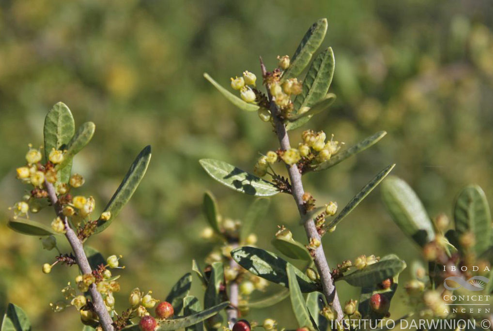 Árboles ramosos desde la base, hasta de 8 m de alto, diclino-monoicos; corteza pardo-oscura a pardo-grisácea; ramas espinescentes, divaricadas, más o menos pubescentes cuando jóvenes, glabrescentes a la madurez. Hojas simples, fasciculadas sobre braquiblastos en lasramas maduras, dimorfas; pecíolo no alado, de 0,1-0,3 cm de largo; lámina de forma muy variable, desde obovada u oblanceolada hasta obcordada o romboidal, de (0,7-)1-3 × 0,4-2 cm, ápice obtuso, en ocasiones emarginado o retuso, base cuneada, en ocasiones redondeada, margen plano a subrevoluto, entero, en ocasiones con 3-5 dientes/lóbulos apicales o repando, glabra a subglabra en la cara adaxial, pubescente en la cara abaxial, en ocasiones subglabra, cartácea a subcartácea, venación conspicua. Inflorescencias en pseudoracimos paucifloros y congestos, axilares, hasta de 1 cm de largo (hasta de 2 cm de largo en fructificación); raquis con pubescencia de tricomas extensos y tricomas glandulares capitados, brácteas isomorfas. Flores 5-meras; pedicelos ca. 1 mm de largo, notoriamente articulados; cáliz con lóbulos ca. 0,5 mm de largo; pétalos obovados, ca. 1,5 mm de largo, glabros, blancos. Flores pistiladas con gineceo ca. 1 mm de largo. Drupa de 0,3-0,5 cm de diámetro, glabra, morada a violácea