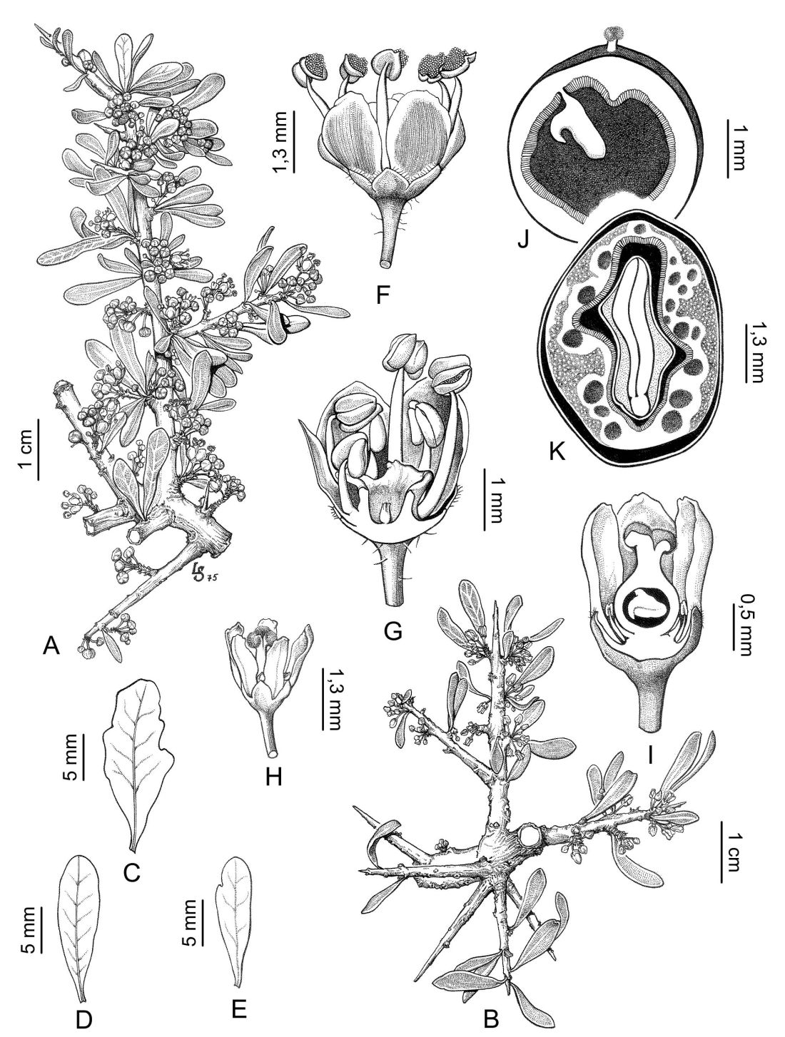 Árboles ramosos desde la base, hasta de 8 m de alto, diclino-monoicos; corteza pardo-oscura a pardo-grisácea; ramas espinescentes, divaricadas, más o menos pubescentes cuando jóvenes, glabrescentes a la madurez. Hojas simples, fasciculadas sobre braquiblastos en lasramas maduras, dimorfas; pecíolo no alado, de 0,1-0,3 cm de largo; lámina de forma muy variable, desde obovada u oblanceolada hasta obcordada o romboidal, de (0,7-)1-3 × 0,4-2 cm, ápice obtuso, en ocasiones emarginado o retuso, base cuneada, en ocasiones redondeada, margen plano a subrevoluto, entero, en ocasiones con 3-5 dientes/lóbulos apicales o repando, glabra a subglabra en la cara adaxial, pubescente en la cara abaxial, en ocasiones subglabra, cartácea a subcartácea, venación conspicua. Inflorescencias en pseudoracimos paucifloros y congestos, axilares, hasta de 1 cm de largo (hasta de 2 cm de largo en fructificación); raquis con pubescencia de tricomas extensos y tricomas glandulares capitados, brácteas isomorfas. Flores 5-meras; pedicelos ca. 1 mm de largo, notoriamente articulados; cáliz con lóbulos ca. 0,5 mm de largo; pétalos obovados, ca. 1,5 mm de largo, glabros, blancos. Flores pistiladas con gineceo ca. 1 mm de largo. Drupa de 0,3-0,5 cm de diámetro, glabra, morada a violácea