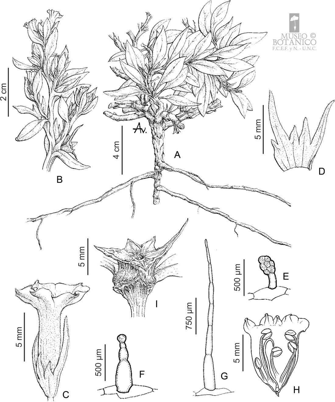 A. Planta. B. Rama florífera y fructífera. C. Flor. D. Cáliz desplegado. E-F. Tricomas glandulares del cáliz. G. Tricoma eglandular del cáliz. H. Corola desplegada y gineceo. I. Cáliz fructífero.