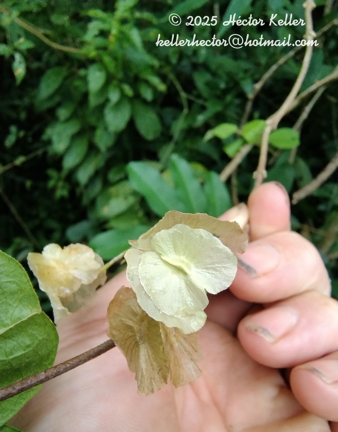 de largo. Hojas con estípulas interpeciolares, de 0,9-1,1 mm de largo, lineares, pubescentes, caedizas; pecíolos de 0,5-1 cm de largo, canaliculados en la cara adaxial, eglandulosos, con pubescencia velutina densa; láminas anchamente elípticas, de 6,5-15 × 3-9 cm, de base levemente cordada, ápice acuminado, discolores, cara adaxial oscura, escasamente pubescente y cara abaxial más clara con pubescencia muy abundante. Inflorescencias en seudoumbelas compuestas; brácteas de 2,7-3,5 mm de largo, triangulares; pedúnculos florales de 3-3,3 mm de largo, seríceos; bractéolas de 1,8-2,1 mm de largo, seríceas en la cara abaxial; pedicelos de 8,7-9,5 mm de largo, acrescentes en el fruto; sépalos ovados, de 1,9-2,8 mm de largo, pubescentes en la cara abaxial, glándulas oblongas, de 0,5-1 mm de largo; pétalos amarillos, de 5-7 × 2,5-3 mm, limbo oblongo, margen entero o levemente eroso, el posterior con uña más gruesa; androceo con filamentos de 2,2-3 mm de largo, los opositisépalos más gruesos, anteras ovoides, de 0,8-1 mm de largo; ovario de 1,5-1,8 mm de largo, muy pubescente, estilos 2,8-3 mm de largo, con ápice redondeado a truncado. Mericarpos samaroides con alas membranáceas, reticuladas, alas laterales de 2,3-2,6 × 1,2-1,5 cm, subcirculares, ápice apenas hendido, base entera, ala dorsal de 0,9-1,2 × 0,2-0,3 cm.