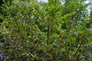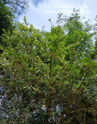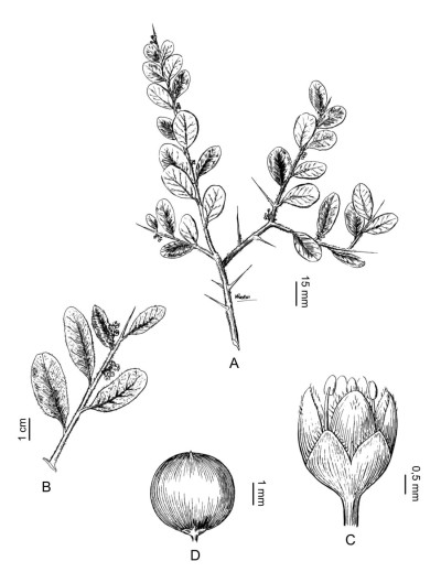 Arbustos ramosos, hasta de 4 m de alto, diclino-monoicos; corteza parda a pardo-grisácea;ramas espinescentes, divaricadas, tomentosas con tricomas ocráceos cuando jóvenes, grisáceas y glabrescentes a la madurez. Hojas simples; pecíolo no alado, de 0,2-0,4 cm de largo; lámina elíptica a obovada, de 1,8-4,5 × 1,3-2,3 cm, ápice apiculado, en ocasiones obtuso a redondeado, base obtusa, raro aguda, margen plano a subrevoluto, entero, ligeramente dentado o irregular, tomentosa en ambas caras, membranácea a subcartácea, venación conspicua. Inflorescencias en pseudoracimos paucifloros y congestos, axilares, de 0,2-0,6 cm de largo; raquis tomentoso con tricomas ocráceos y brácteas isomorfas. Flores 5-meras, de 2-4 mm de largo; pedicelos notoriamente articulados; cáliz con lóbulos ca. 1 mm de largo; elípticos a ovados, ca. 1,5 mm de largo, margen ciliado en la porción apical; pétalos blanco-verdosos. Flores pistiladas con gineceo ca. 0,5 mm de largo. Drupa de 0,5-0,6 cm de diámetro, glabra, violácea.
