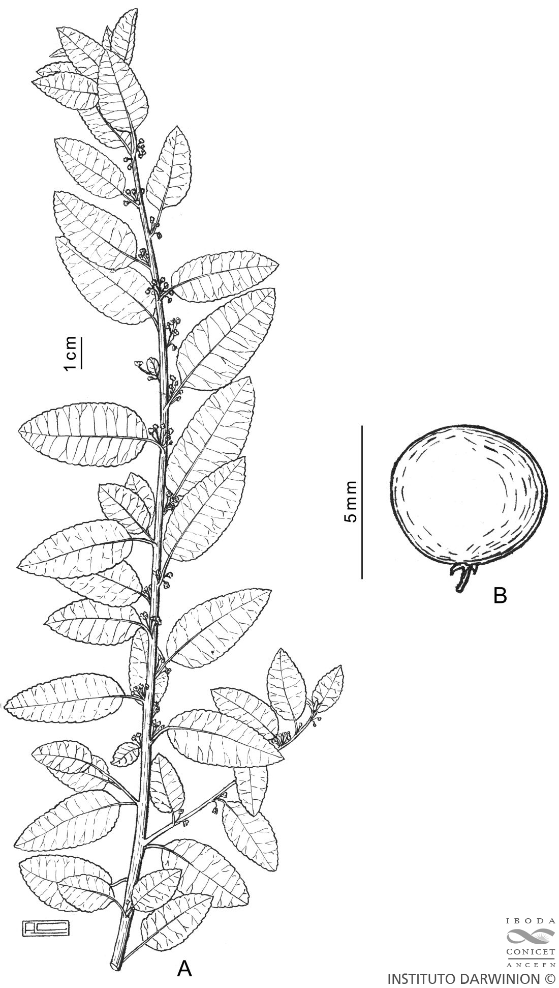 Árboles o arbustos ramosos, hasta de 10 m de alto, diclinomonoicos; ramasinermes, postradas, glabras o con pubescencia variada, pardo-grisáceas. Hojas simples; pecíolo no alado de 0,5-1,2 cm de largo; lámina ovada a ovado-lanceolada, de 2,5-5,8 × 1,4-2,5 cm, ápice obtuso, a veces agudo o redondeado, base obtusa, cuneada o algo decurrente, a veces redondeada o truncada, margen crenado, crenado-serrado, serrulado o eroso, pubescencia variada en ambas caras, membranácea a cartácea, venación conspicua. Inflorescencias axilares y terminales; brácteas dimorfas. Inflorescencias estaminadas en tirsoides o panículas, en ocasiones pseudoracimos, de 1-4,5 cm de largo. Inflorescencias pistiladas en pseudoracimos, a veces en tirsoides, de 0,6-1 cm de largo. Flores 4-meras; pedicelos de 2-6 mm de largo, notoriamente articulados; cáliz con lóbulos de 0,4-1,1 mm de largo; pétalos ovados u obovados, de 1-2 mm de largo, ciliados, blanquecinos o blanco-verdosos. Flores pistiladas con gineceo de 0,8-1,2 mm de largo. Drupa de 6-7,7 × 4,6-5,3 mm, glabra o con tricomas glandulares esparcidos, a veces glabrescente, rojiza
