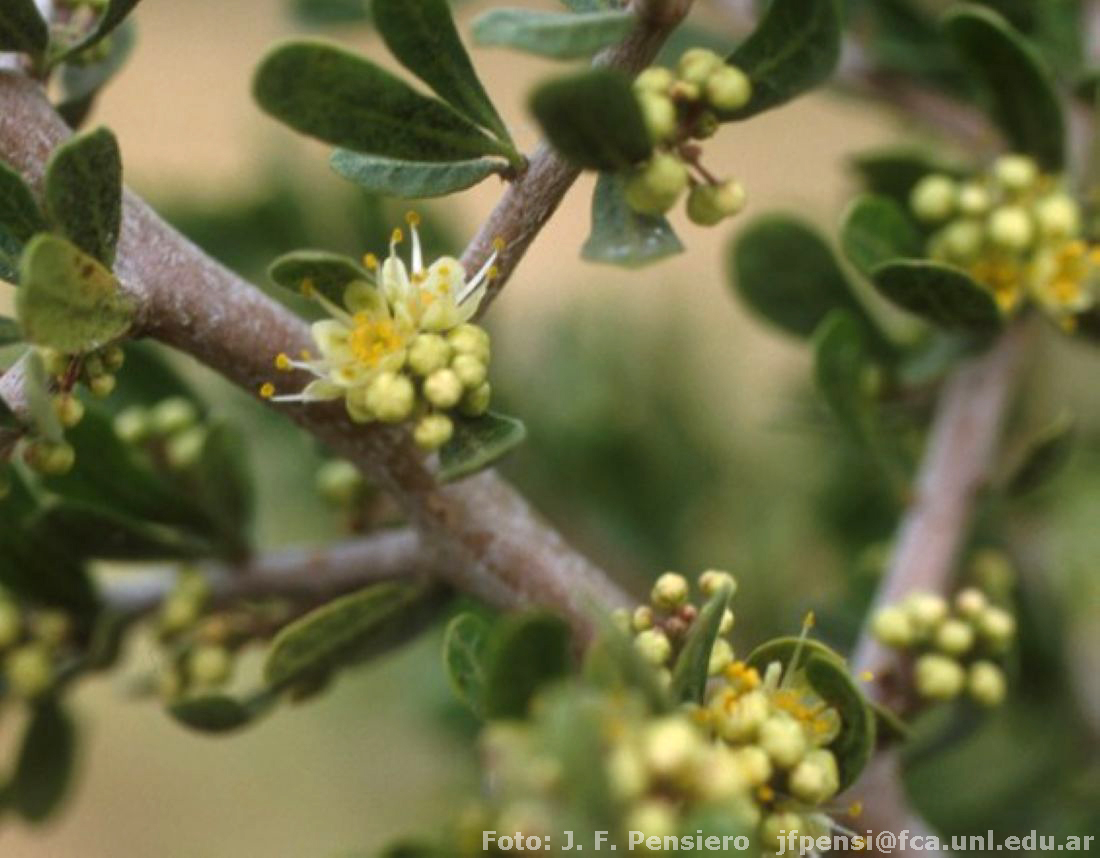 Arbustosramosos, hasta de 3 m de alto, diclino-monoicos, en ocasiones con algunas flores perfectas; corteza grisácea, estriada; ramas espinescentes, divaricadas, ocráceas o castaño-rojizas y pubescentes cuando jóvenes, luego grisáceas y glabrescentes. Hojas fasciculadas sobre braquiblastos, simples, dimorfas, subsésiles; lámina elíptica, obovada u orbicular, las mayores de 1,1-1,7 × 0,3-0,7 cm, las menores de 0,3-0,7 × 0,4-1 cm, ápice redondeado o mucronado, base aguda u obtusa, margen plano, entero, raro con unos pocos dientes inconspicuos, glabra en ambas caras, coriácea, venación conspicua. Inflorescencias en pseudoracimos multifloros y congestos, axilares, hasta de 0,5 cm de largo; raquis escasamente pubérulo y brácteas isomorfas. Flores 5-meras; pedicelos ca. 2 mm de largo, notoriamente articulados; cáliz con lóbulos ca. 1 mm de largo; pétalos obovados, de 1,5-2 mm de largo, glabros, crema o blanquecinos. Flores pistiladas con gineceo ca. 1,5 mm de largo. Drupa de 7-8 mm de diámetro, glabra, morada o violácea