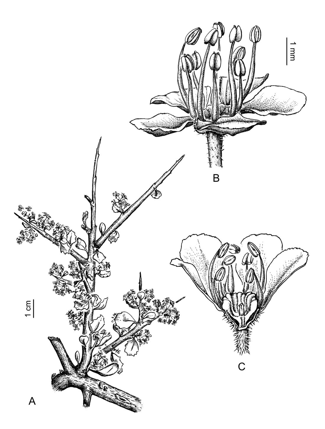 A. Aspecto de una rama florífera. B. Vista lateral de una flor estaminada. C. Corte longitudinal de una flor estaminada.