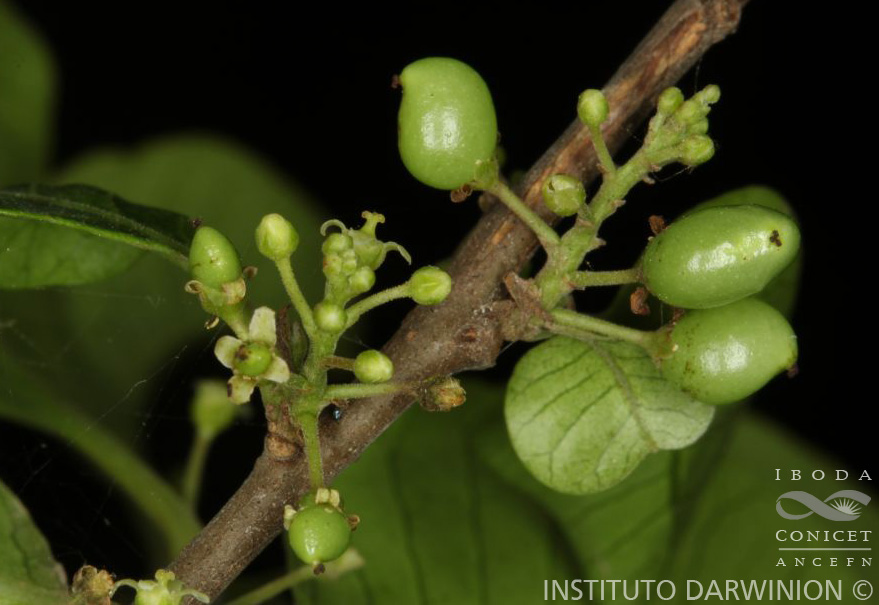 Árboles o arbustos ramosos, hasta de 5 m de alto, diclinomonoicos; ramas inermes, postradas, pardo-grisáceas, pubérulas con tricomas glandulares o glabras. Hojas simples; pecíolo de 0,3-1,5 cm de largo, no alado; lámina ovada a ovado-lanceolada, de 3,5-5,7 × 1,7-2,5 cm, ápice obtuso, raro agudo o redondeado, base decurrente a obtusa, en ocasiones redondeada, margen subrevoluto, entero, crenado, crenado-serrado o eroso en la porción distal, pubérula en la vena media, resto de la lámina con tricomas glandulares, cartácea a subcartácea, venación conspicua. Inflorescencias axilares y terminales; brácteas dimorfas. Inflorescencias estaminadas en pseudoracimos congestos, ramificados en la base, en ocasiones no ramificados, de 0,8-3 cm de largo, raro flores solitarias. Inflorescencias pistiladas en pseudoracimos congestos, de 1,2-3,5 cm de largo. Flores 4-meras; pedicelos de 1,7-5,7 mm de largo, con articulación no aparente; cáliz con lóbulos de 0,7-1,1 mm de largo, pubérulos o glabros; pétalos oblongos, obovados u ovados, de 1,7-2,3 mm de largo, glabros, blanco-verdosos o crema. Flores pistiladas con gineceo de 1-1,4 mm de largo. Drupa de 5,2-6,5 × 6,1-6,5 mm, con pubescencia hirsuta esparcida, luego glabrescente, rojiza a rosada.
