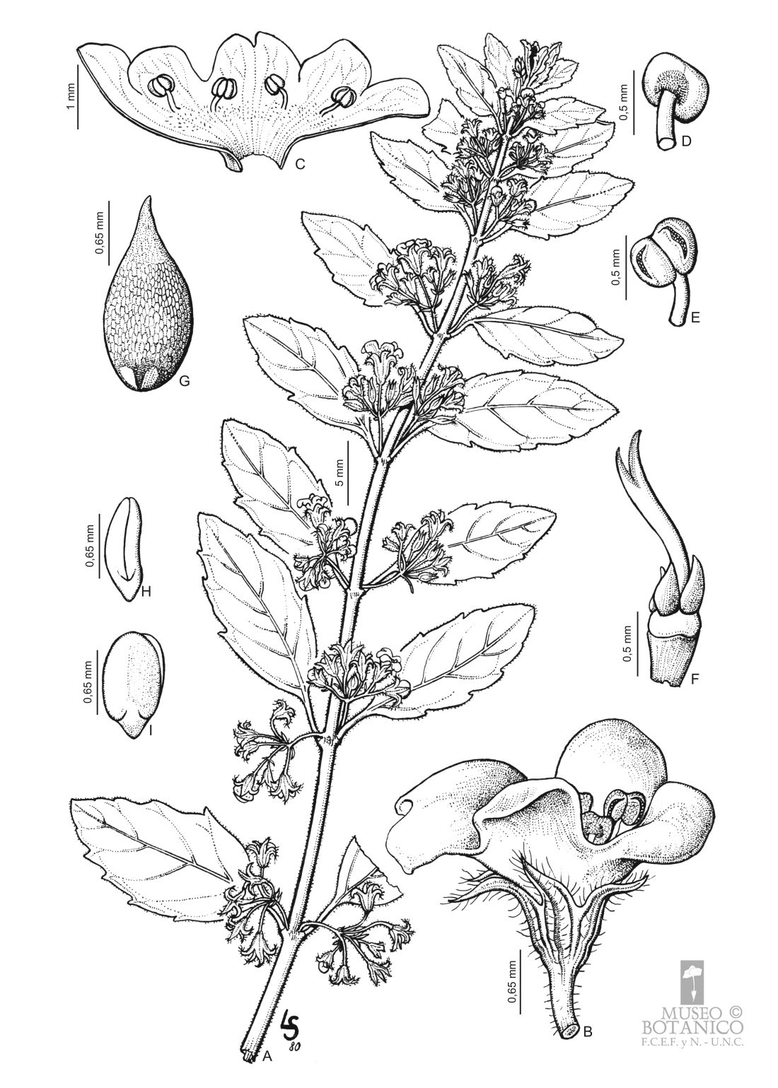 A. Sector apical de ramita. B. Flor. C. Corola desplegada. D-E. Antera, caras dorsal y ventral, respect. F. Gineceo. G. Núcula. H-I. Embrión .