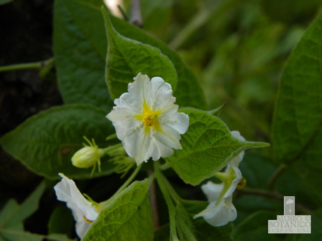 Arbustos de 1,5-4 m de alto; tallos, hojas y pedicelos con abundantes tricomas ramificados. Hojas solitarias; pecíolos de 0,5-3,5 cm; láminas ovadas, de 3,5-9(-12) × 1,5-3,7(-6,5) cm, base atenuada, ápice acuminado. Inflorescencias axilares o apenas supraaxilares, de (2-)4-8 flores. Flores con pedicelos de 1,8-2,5 (-3,5) cm; cáliz pubescente, de 1,8-2,3 mm, con 7-10 apéndices lineares, desiguales; corola blanca con el centro amarillo, de 7- 9(-12,5) mm; androceo heterodínamo, filamentos glabrescentes a pubescentes, tres más largos y subiguales (uno de 1,5-1,8 mm, los otros dos de 1,2-1,5 mm) que los dos restantes (de 0,5-0,9 mm), estos últimos con giba en la base, anteras de 1,9-3 mm; ovario de 1,3-2 mm, estilo de 3,5-4,6 mm, estigma 2-lobado. Bayas anaranjadas o rojas, globoso-deprimidas, de 7-9 mm de diámetro, pericarpo con crecimiento hacia el septo, esclerosomas hasta 11; semillas de 2,3-2,7 × 2,9-4 mm.
