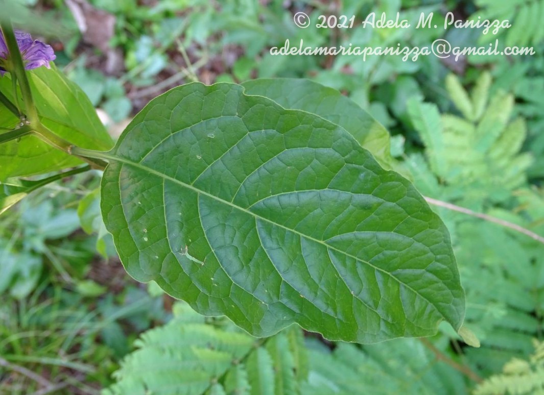 Arbustos de 0,5-1,5 m de alto, a veces apoyantes; tallos 3-4- aristados, los jóvenes con tricomas simples o ramificados. Hojas solitarias o, a veces, geminadas, con tricomas dispersos en el epifilo; pecíolos de 1-2,5(-4) cm; láminas elípticas u ovadas, de 6,5-9(-14) × 3,5-5(-7,5) cm, base atenuada, ápice acuminado. Inflorescencias axilares, de 3-7 flores. Flores con pedicelos pubescentes, de 1,2-1,6 cm; cáliz de 3,2-4 mm, con 10 (raro 5) apéndices lineares, agudos, desiguales, muy breves o hasta de 5,2 mm de largo, con tricomas simples o ramificados; corola violácea, de 13,5-18 mm; androceo heterodínamo, filamentos pubescentes, 3 más largos, de 2-3 mm, los otros 2 más cortos, de 0,8-1,3 mm, con una giba en su base, anteras de 3-4 mm; ovario de 1,8-2,3 mm, estilo de 4-5,5 mm, estigma discoide. Baya amarilla, globoso-comprimida, de 2-3,5 cm de diámetro; pericarpo sin proliferaciones hacia los lóculos y con más de 20 esclerosomas; semillas de 3,5 × 3-3,3 mm.