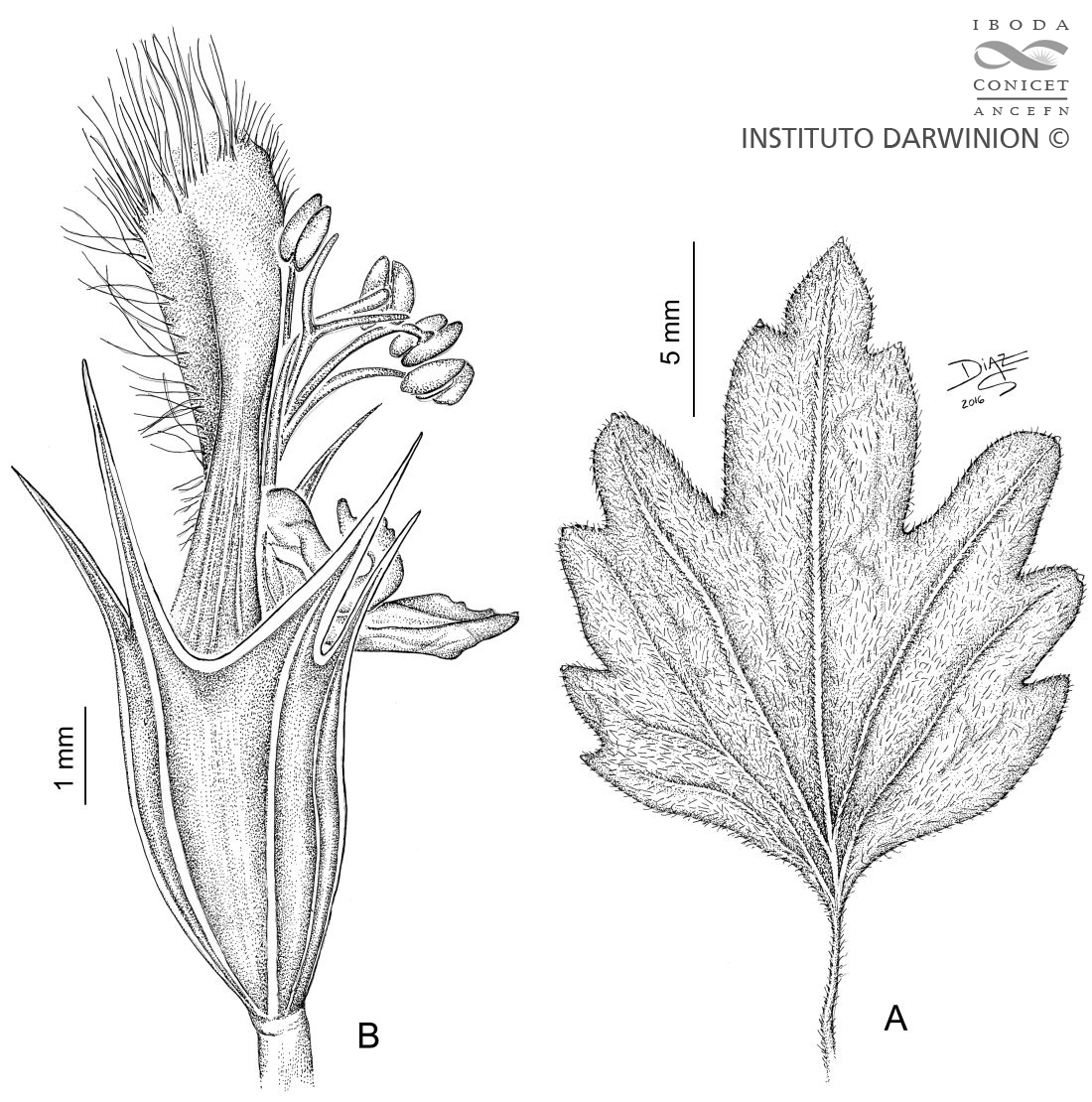 Hierbas hasta de 1 m de alto; tallos glabros o pubérulos, simples o ramosos. Hojas pecioladas, con pecíolos de 1-5 cm de largo, láminas palmatipartidas, de 2-10 × 3-7 cm, 3 segmentos irregularmente divididos, pubescencia densa en el envés. Flores sésiles dispuestas en verticilastros plurifloros distantes entre sí 1,5-7 cm; cáliz infundibuliforme ca. 7 mm de largo, dientes subiguales ca. 2 mm de largo; corola de 8-13 mm de largo, lila o morada, densamente cano-pubescente en la mitad superior del tubo y en los labios, labio superior cóncavo, de 5-7 mm de largo, labio inferior de 6-7 mm de largo, lóbulo medio 2-lobulado, mayor que los laterales; filamentos estaminales pilosos en la base; estilo glabro; ramas estigmáticas subiguales. Clusas ca. 2 mm de largo.