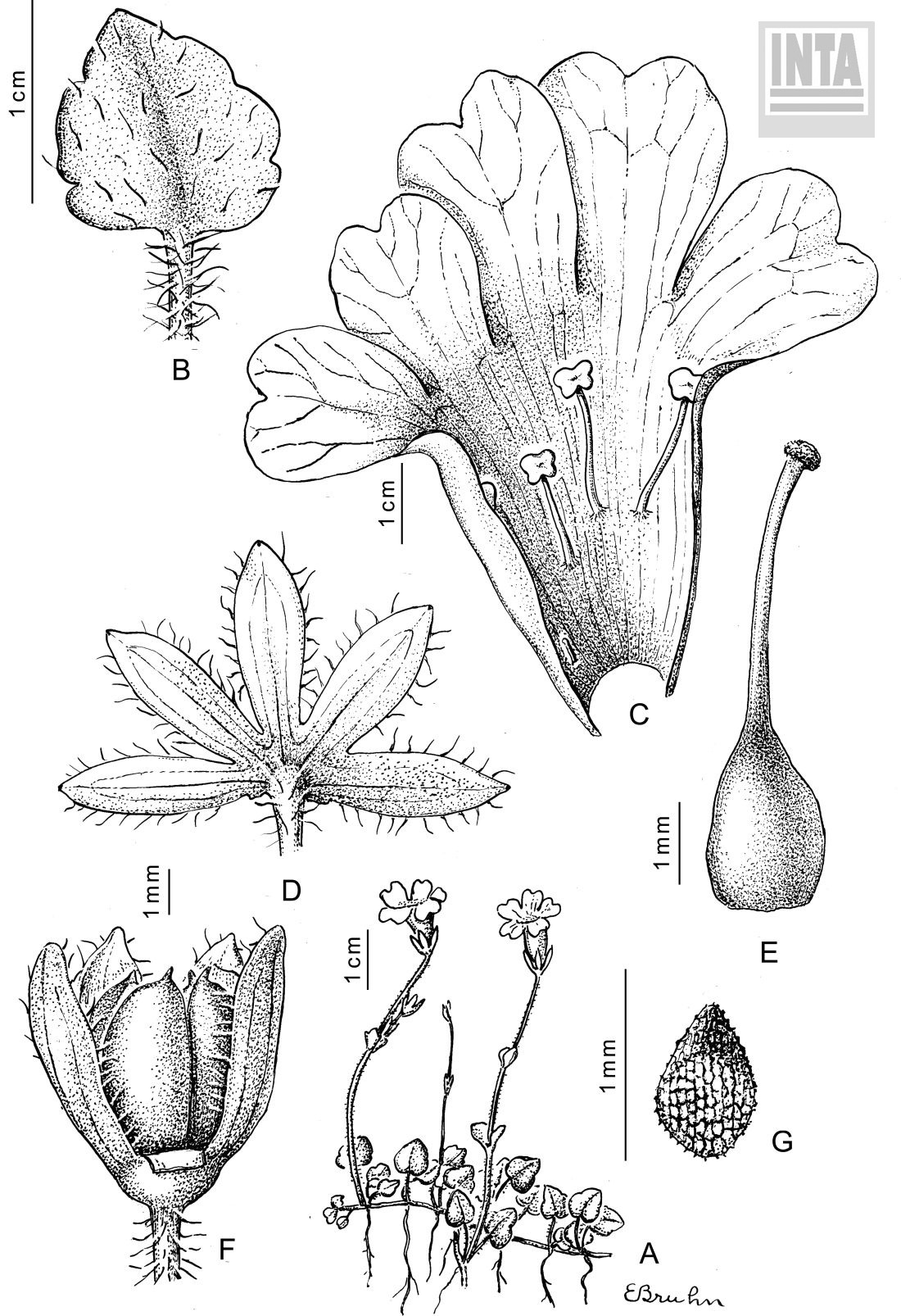 Hierbas perennes, rastreras, de 1-11,2 cm de alto, rizomatosas. Tallos glabros o pubescentes, entrenudos de 2,2-9,5 mm de largo. Hojas opuesto-decusadas, con pecíolo glabrescente o piloso, de 1,6-45 mm de largo; láminas ovadas a sub-orbiculares o elípticas, de 4-14 × 2-12 mm, base ligeramente cordada o bien truncada o cuneada, ápice redondeado, margen subentero a serrado, a veces regularmente crenado o lobado, glabra o pilosa en ambas caras. Racimos erectos, bracteados, de 3-15 mm de largo, 1-2 nudos florales, con 1 a 2(-3) flores por nudo; pedúnculo de 8-55 mm de largo, pubescente. Flores con pedicelos de 7-32 mm de largo, densamente pilosos o, en ocasiones, vellosos y con pelos glandulares; brácteas florales 2, sésiles o pecioladas, glabras, pubescentes o pilosas. Cáliz 5-partido, de 4-8 mm de largo, lóbulos obovados de 3-5 × 1,2-1,5 mm, glabros o glanduloso-pubescentes por fuera. Corola lila, rosada o malva, bilabiada, de 8-14,2 mm de largo, tubo de 10-16 mm de largo, recto o ligeramente curvo, glabro, lóbulos obovados, 3-6 × 2-4,5 mm, subiguales, con o sin estrías púrpuras. Estambres 4, didínamos. Ovario elipsoide, de 1,8-2,2 × 1-1,3 mm, glabro; estilo de 4 mm de largo, incluso; estigma capitado. Cápsulas comprimidas, suborbiculares, de 4-6 mm de largo, glabras, con dehiscencia loculicida o en ocasiones parcialmente septicida. Semillas ca. 80 por cápsula, 0,5-1 mm de largo, reticuladas. Láminas pilosas en la cara adaxial, con tricomas más o menos densos; corola con estrías púrpuras distintivas.