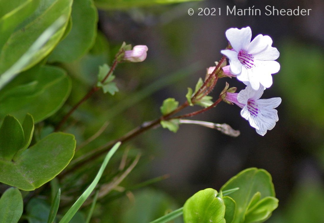 Hierbas perennes, rastreras, de 1-11,2 cm de alto, rizomatosas. Tallos glabros o pubescentes, entrenudos de 2,2-9,5 mm de largo. Hojas opuesto-decusadas, con pecíolo glabrescente o piloso, de 1,6-45 mm de largo; láminas ovadas a sub-orbiculares o elípticas, de 4-14 × 2-12 mm, base ligeramente cordada o bien truncada o cuneada, ápice redondeado, margen subentero a serrado, a veces regularmente crenado o lobado, glabra o pilosa en ambas caras. Racimos erectos, bracteados, de 3-15 mm de largo, 1-2 nudos florales, con 1 a 2(-3) flores por nudo; pedúnculo de 8-55 mm de largo, pubescente. Flores con pedicelos de 7-32 mm de largo, densamente pilosos o, en ocasiones, vellosos y con pelos glandulares; brácteas florales 2, sésiles o pecioladas, glabras, pubescentes o pilosas. Cáliz 5-partido, de 4-8 mm de largo, lóbulos obovados de 3-5 × 1,2-1,5 mm, glabros o glanduloso-pubescentes por fuera. Corola lila, rosada o malva, bilabiada, de 8-14,2 mm de largo, tubo de 10-16 mm de largo, recto o ligeramente curvo, glabro, lóbulos obovados, 3-6 × 2-4,5 mm, subiguales, con o sin estrías púrpuras. Estambres 4, didínamos. Ovario elipsoide, de 1,8-2,2 × 1-1,3 mm, glabro; estilo de 4 mm de largo, incluso; estigma capitado. Cápsulas comprimidas, suborbiculares, de 4-6 mm de largo, glabras, con dehiscencia loculicida o en ocasiones parcialmente septicida. Semillas ca. 80 por cápsula, 0,5-1 mm de largo, reticuladas. Láminas pilosas en la cara adaxial, con tricomas más o menos densos; corola con estrías púrpuras distintivas.
