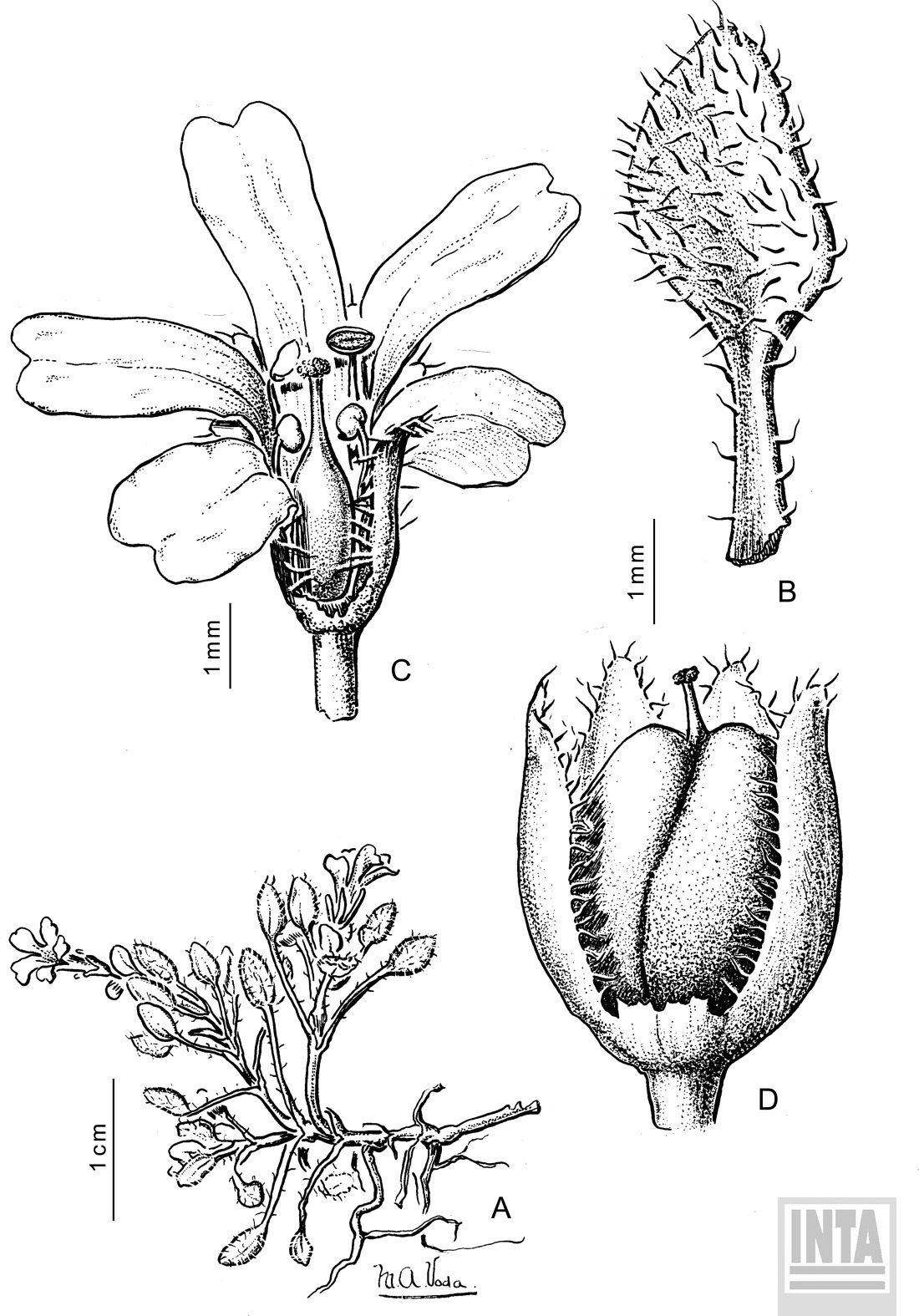 Hierbas perennes, rastreras, subrosuladas, de 0,8-1,7 cm de alto. Tallos glabros, entrenudos poco notables, hasta de 2,7 mm de largo. Hojas opuesto-decusadas, pecíolos de 1,8- 8,5 mm de largo, con pubescencia glandular; láminas ovadas a suborbiculares, de 1,3-4,6 × 1,2-3,9 mm, base cuneada, en ocasiones truncada, a veces irregular, ápice redondeado, margen entero o con 1-2 dientes hacia la base, carnosas, densamente pubescentes en la cara adaxial, con pelos eglandulares, glabras en la cara abaxial. Flores solitarias, con pedicelos de 1,4-2,4 mm de largo, glabros; brácteas florales de 1,3-3 mm de largo, pecioladas; lámina ovada u obovada, margen entero o con 1-2 dientes, con pelos eglandulares. Cáliz 5-partido, de 2,5-4,5 mm de largo, lóbulos obovados, de 1,7-3 × 0,9-1,1 mm, ciliados. Corola violácea o blanca, bilabiada, de 5-5,6 mm de largo, tubo de 2,3-3,6 mm de largo, glabro, labio superior 2-lobado con lóbulos obovados, de 1,3-3,3 mm, labio inferior 3-lobado, 1,8-2,2 mm de largo. Estambres 4, didínamos o subiguales. Ovario subgloboso, de 1,35-2 × 1-1,7 mm; estilo incluso; estigma capitado. Cápsulas ovoides a suborbiculares, de 2-4 × 2-2,5 mm, incluidas en el cáliz. Semillas numerosas, de 0,7-0,9 mm de largo, testa reticulada.