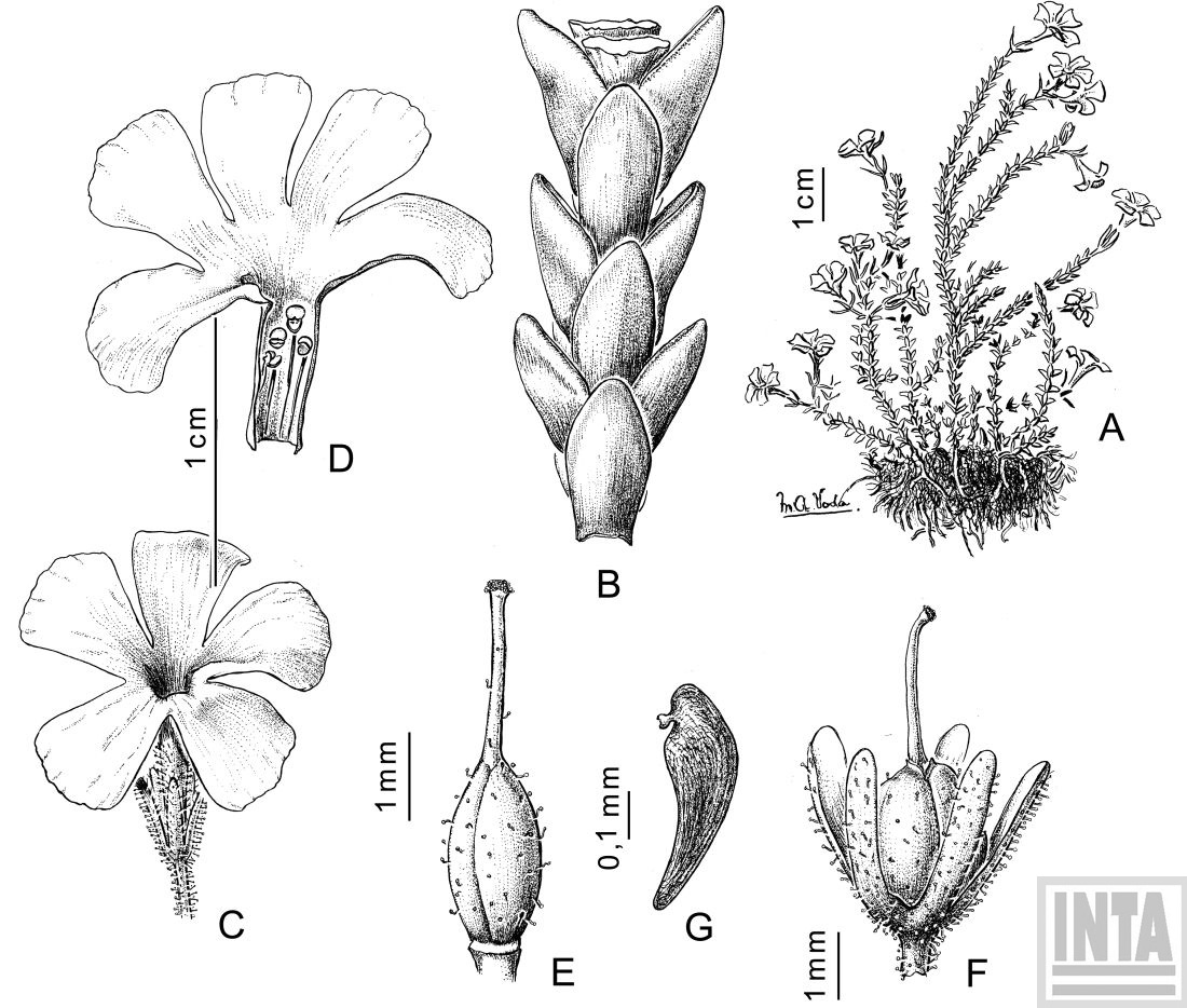 Sufrútices de 5-15 cm de alto. Tallos glabros o glanduloso- pubescentes, entrenudos de 0,1-3,5 mm de largo. Hojas sésiles, imbricadas; láminas ovadas, a veces obovadas o elípticas, de 1-4,5 × 1-3,5 mm, base amplexicaule, ápice agudo, carnosas, cónvacas, cara adaxial glanduloso-pubescente, cara abaxial glabra o glanduloso-pubescente. Flores solitarias, axilares, ebracteadas, con pedicelos de 1-6 mm de largo, glanduloso- pubescentes. Cáliz 5-partido, de 2,3-2,7 mm de largo, densamente glanduloso-pubescente interna y externamente; lóbulos elípticos, de 2-3 × 0,6-1 mm, ápice redondeado, no emarginados, cara abaxial sin venas prominentes. Corola rosada o púrpura, en ocasiones blanca, sub-actinomorfa, de 9,8-14,5 mm de largo; tubo de 6-8 mm de largo. Estambres 4, didínamos; estaminodio presente, dorsal. Ovario 1,3-1,6 mm de largo, glanduloso-pubescente; estilo incluso; estigma poco diferenciado. Cápsulas orbiculares, comprimidas, de 2-3 × 2-3 mm, glabras o con escasos pelos glandulares, con la base del estilo persistente. Semillas fusiformes a poliédricas, de 0,6-0,7 mm de largo, testa reticulada.