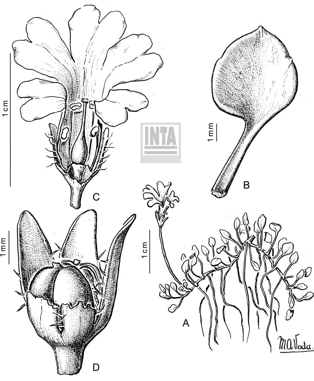 A. Planta. B. Hoja. C. Corola desplegada. D. Fruto.