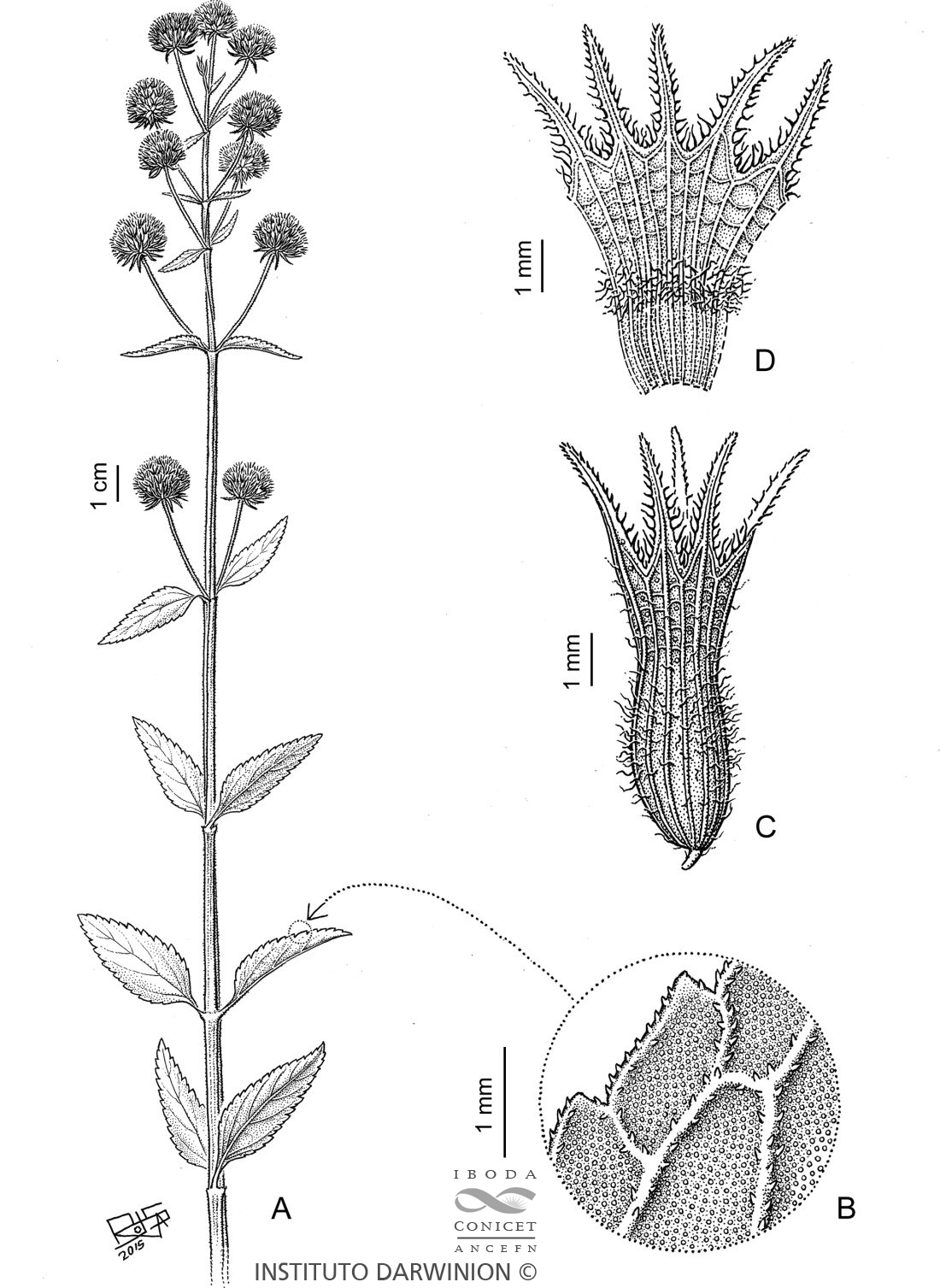 Hierbas perennes hasta de 2 m de alto; tallos subglabros o pilosos con pelos adpresos. Hojas pecioladas; pecíolos de 3-10 mm de largo; láminas angostamente ovadas, de 4,5-10 × 0,5-2 cm, base atenuada, decurrente, ápice agudo, margen finamente aserrado, subglabras, en ocasiones estrigosas en la cara adaxial, con escasos pelos dispersos, o sobre las nervaduras de la cara abaxial, con abundantes glándulas sésiles en cara abaxial. Capítulos globosos, de 1-1,5 cm de diámetro, multifloros, solitarios en la axila de las hojas superiores, pedúnculos de 0,5-4 cm de largo, glabros o pilosos; bractéolas involucrales ovadas, de 8-15 mm, acuminadas, estrigosas, margen ciliado. Flores subsésiles, con pubescencia de pelos muy largos en la base, naciendo del receptáculo; cáliz florífero de 3,7-5 mm de largo, acrescente hasta 8 mm en el fruto, exterior ligeramente estrigoso, con pelos entremezclados con otros pelos glandulares sésiles, internamente con una densa banda de pelos gruesos, breves, margen ciliado, dientes del cáliz triangulares, de 2-3,5 mm de largo, largamente aristados; corola blanca con manchas rosadas, de 5-8 mm de largo. Clusas ovoides, de 1,5 mm de largo, castaño-oscuras, glabras.