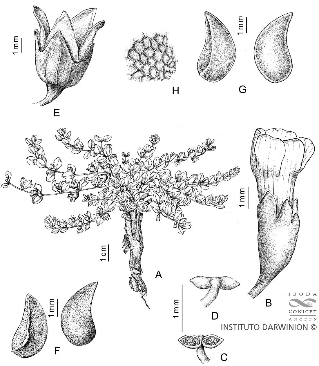 Sufrútices hasta de 30 cm de alto. Hojas de 1-2,5 × 0,3-1 cm. Flores de 6-10 mm de largo. Cáliz de 3,5-6,5 mm de largo, diente inferior de 1,5-3 mm. Corola con tubo de 4,5-7 mm de largo. Estambres laterales con filamentos de 2-2,5 mm de largo, los ventrales de 3,5-4 mm de largo. Ovario de 1-1,5 × 1 mm; estilo de 1,5-2 mm de largo. Cápsulas de 5,5-6,5 mm de largo. Hojas elípticas u orbiculares u ovado-angostas, de 1-2 x 0,5-1,5 cm.
