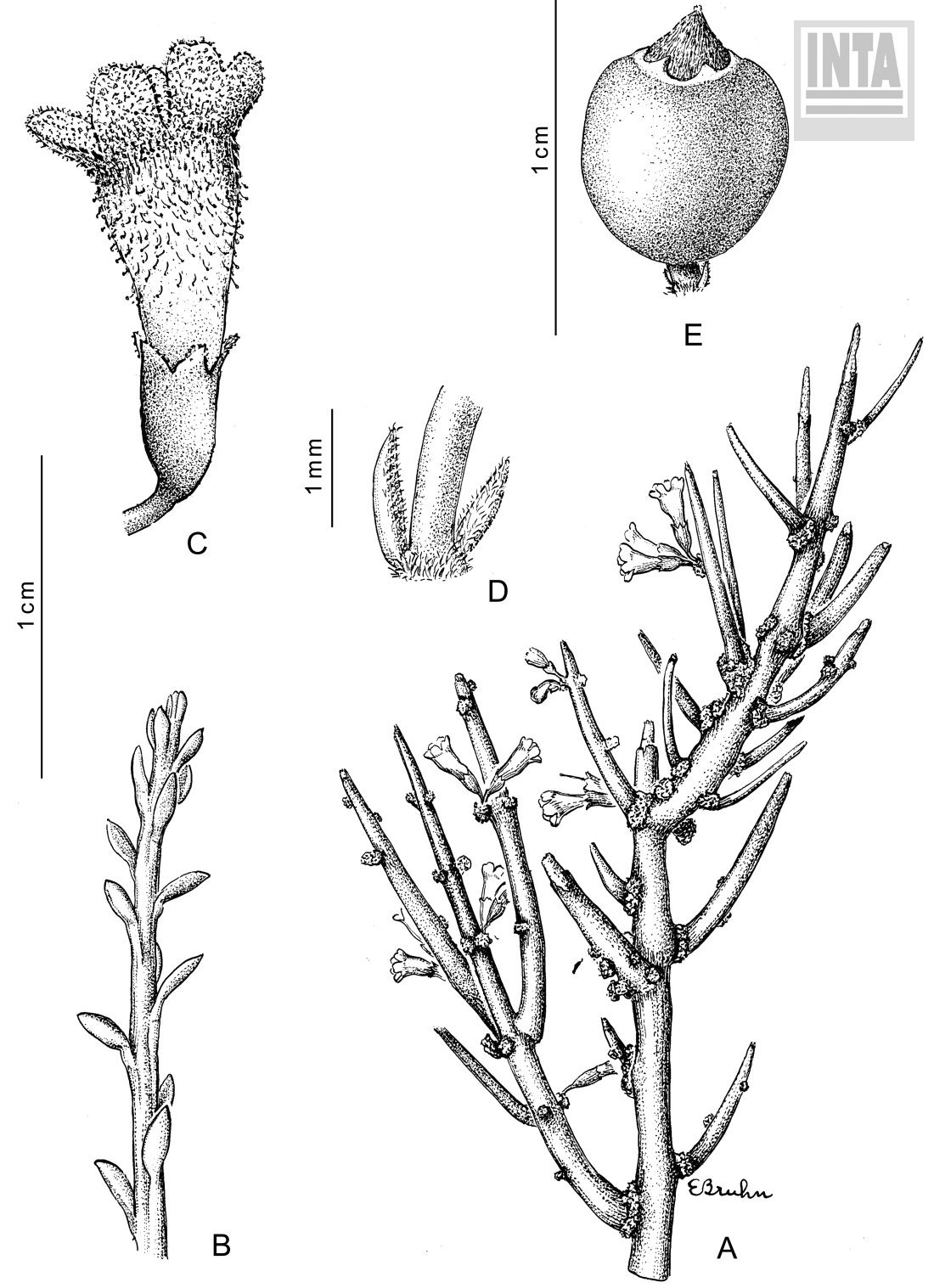 Arbustos hasta de 2 m de alto, de aspecto subáfilo; ramas glabras, cerosas, las jóvenes subespinosas. Hojas opuestas o alternas, obovadas, de 2-3 × 1-1,5 mm, apiculadas, carnosas, glabras, caedizas. Flores en pseudofascículos 2-4-floros, excepcionalmente solitarias; brácteas florales subuladas, de 1-1,3 mm de largo, glandulosas. Cáliz de 5,5-7,5 mm, glabro, ceroso, con algunos pelos glandulosos, 5 dientes triangulares, de 1-1,5 mm de largo. Corola de 12-16 mm de largo, de color violeta o azul, garganta amarilla, tubo de 8-12 mm de largo, externamente con pubescencia retrorsa densa y pelos glandulares, internamente con pelos glandulares, lóbulos con pelos glandulares. Estambres con filamentos pubescentes en la porción libre o glabros; anteras ovoides, de 1-1,3 mm de largo. Ovario ovoide, de 1,5-2,5 × 1,3-1,5 mm, densamente cubierto de pelos breves, adpresos. Cápsulas ovado-elipsoides, de 5-7 × 3,5-6 mm.