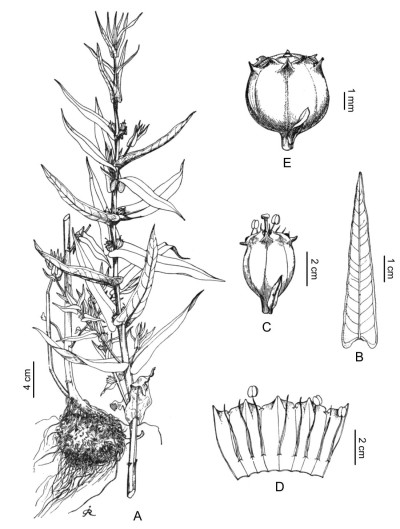 Hierbas anuales hasta de 1 m de alto, robustas, no ramificadas o con ramificaciones desde la base. Hojas con láminas linear-lanceoladas, a veces elípticas a espatuladas, de 15-80 × 4-15 mm, base auriculada, ápice obtuso a generalmente agudo. Inflorescencias en cimas axilares, sésiles, de 1-3(-5) flores; tubo corolino urceolado, generalmente con 4 crestas o subalado, ca. 3,5 × 2 mm; bractéolas 2, lineares ca. de la altura del tubo floral; lóbulos del cáliz alternando con apéndices engrosados de longitud igual a los lóbulos; pétalos 4(-8), obovados, ca. 2,5 × 3 mm, lavanda, a veces con una mancha rosa oscura en la base del nervio central o rosa-violáceos; estambres 4(-5-12), extendidos; estilo largo, filiforme, ligeramente extendido en la antesis; ovario 2-(4)-locular. Fruto una cápsula de 4-6 mm de diámetro a la madurez.