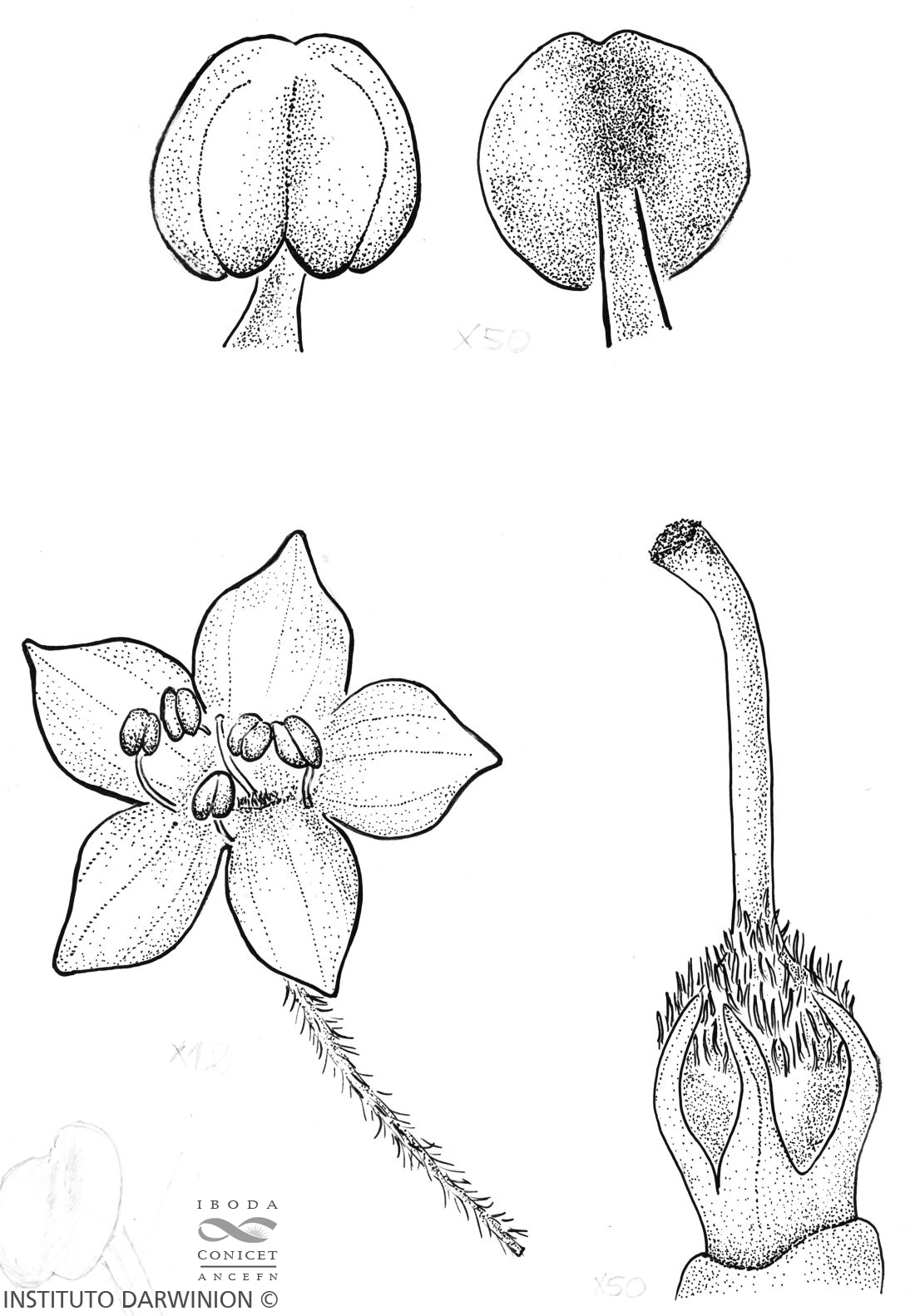 Hierbas perennes, rastreras; tallos pubescentes, hasta de 30 cm de largo, entrenudos de 1-2 cm de largo. Hojas alternas; pecíolos de 0,5-3 cm de largo; láminas orbicular-reniformes, de 0,6-1,5 cm de diámetro, crenadas o aserradas, glabras o ligeramente pubescentes en ambas caras, pelos adpresos. Flores con pedicelo híspido de 0,5-1 cm de largo. Cáliz generalmente 5- partido, de 2-2,2 mm de largo, híspido, dientes triangulares, agudos. Corola de color rojo oscuro a liláceo, de 0,3-0,4 cm de diámetro, lóbulos obovados, redondeados en el ápice, a veces algo mucronados. Estambres 4, o a veces 5, 2 ó 3. Ovario híspido en la mitad superior, rodeado en la base por un anillo de 3 nectarios escamosos, más breves que el ovario; estilo simple; estigma capitado. Cápsulas ca. 0,2 cm de largo.