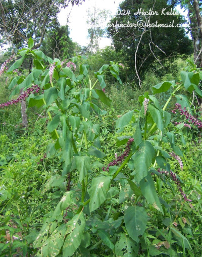 Hierbas hasta de 3 m de alto, erectas o apoyantes, cubiertas de punteaduras blanquecinas, glabras. Hojas con pecíolos de 1,5-5,5 cm de largo; láminas ovadas, lanceoladas a elíptico-lanceoladas, de 7,5-20 × 3-10 cm, de ápice agudo a acuminado, base aguda a decurrente, borde entero u ondulado, membranáceas. Inflorescencias tirsos de 9-32 cm de largo, terminales y pseudolaterales, erectas a recurvadas, ejes levemente pubescentes. Flores perfectas, con pedicelos de 2-7 mm de largo, pubescentes; bráctea lanceolada, de 1,5-8 mm de largo: bracteólas 2, lanceoladas, de 1-2,5 mm de largo, a veces reducidas; tépalos 5, elípticos, de 2,4-4 × 1,5-2,5 mm, cóncavos, glabros, blancos, rojizos o rosados; estambres dispuestos en dos verticilos, el externo abortado o con cuatro estambres, el interno con 8-10 estambres de menor longitud que los tépalos, insertos en un disco subhipógino, filamentos de 1,5-2,5 mm de largo, anteras elípticas, de 0,5-1 mm de largo, blancas; ovario con 7-9 carpelos unidos en la base, estilos cilíndricos recurvados. Fruto una baya de 5-8 mm de diámetro, violácea a negra. Semillas reniformes, de 2,5-3 × 2-2,5 cm, negras, brillantes.