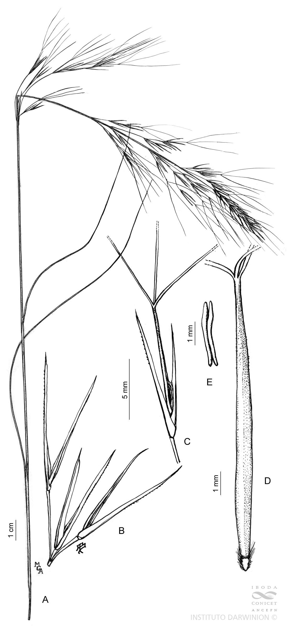 Plantas perennes, de (20-)50-90 cm de alto; cañas simples; vainas estriadas, glabras o con los márgenes cortamente pilosos hacia la porción distal, más cortas o más largas que los entrenudos; cuello de las vainas glabro; lóbulos de las vainas pilosos, con algunos pelos hialinos hasta de 4 mm de largo; lígulas pestañosas de 0,5-1 mm de largo; láminas de 8-40 cm x 0,5-2,5 mm, lineares, acuminadas, flexuosas, curvadas o circinadas, convolutas, a menudo planas hacia la base, cara abaxial escabriúscula, cara adaxial escabriúscula a escabrosa con algunos pelos hialinos hasta de 5 mm de largo cerca de la zona ligular. Inflorescencias de 12-25 x 3-6 cm incluídas las aristas, lineares, contraídas, con las ramificaciones ascendentes y arrimadas al raquis; raquis escabriúsculo, a veces glabro hacia la porción basal; ramificaciones y pedicelos escabriúsculos; glumas desiguales o subiguales en la misma panoja, 1-nervias, ápice agudo, acuminado o con arístula de 1-2,5 mm de largo; gluma inferior de 8-13 mm de largo, escabrosa sobre la quilla; gluma superior de 7-10(-12) mm de largo, glabra; lemma de 8,5-12,5 mm de largo, con o sin un apéndice hialino apical ca. 0,4 mm de largo, los márgenes involutos determinando un surco longitudinal ventral, escabriúscula en los ? superiores; callo de 0,5-0,7(-0,9) mm de largo, barbado, obtuso; aristas de 2,2-3,8(-4,2) cm, capiláceas, escabriúsculas, la central un poco más larga que las laterales, algo aplanadas y curvadas en la base, luego rectas y divergentes; pálea de 1-1,2 mm de largo, membranácea, hialina, con surco ventral, ápice brevemente 2-denticulado; lodículas 2, de 1,3-1,5 mm de largo, membranáceas, hialinas, ápice entero agudo; estambres 3, anteras de 1,7-2,2 mm de largo; cariopsis de 8-8,5 mm de largo, castaña, fusiforme, surco ventral, hilo linear recto, ventral, tan largo como la cariopsis, embrión más o menos ¼ del largo de la cariopsis.