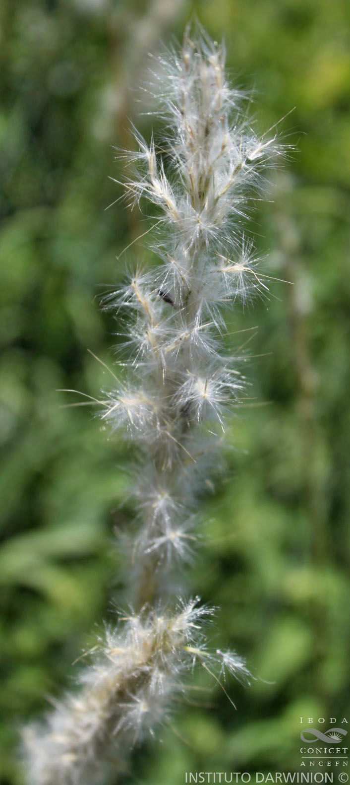 Plantas de 30-95 cm de alto, cespitosas, follaje basilar o caulinar; cañas oscuras o glaucas en la proximidad de los nudos, decumbentes, ramificadas; nudos oscuros o no, glabrescentes o glabros; vainas glabras; lígulas 2-2,6 mm de largo; láminas de 3-20 cm x 3-5 mm, glabras; zona ligular hirsuta o glabra. Inflorescencia una panícula oblonga, de 6-10,5 x 1-5,5 cm, blanco-sedosa. Espiguilla pedicelada de 2-2,6 x 0,1-0,3 mm, escabrosa, reducida, neutra. Espiguilla sésil 2,5 x 0,5-1 mm, angostamente elipsoide, casmógama, no foveolada y escabrosa hacia el ápice; gluma inferior 6-7-nervia, pilosas en los ? inferiores, ápice bífido; gluma superior de 2,5-2,7 mm de largo; lemma inferior estéril de 1,5 mm de largo, enervia, arista de 8-15 mm de largo; estigmas de 1-1,5 mm de largo, hialinos o purpúreos.