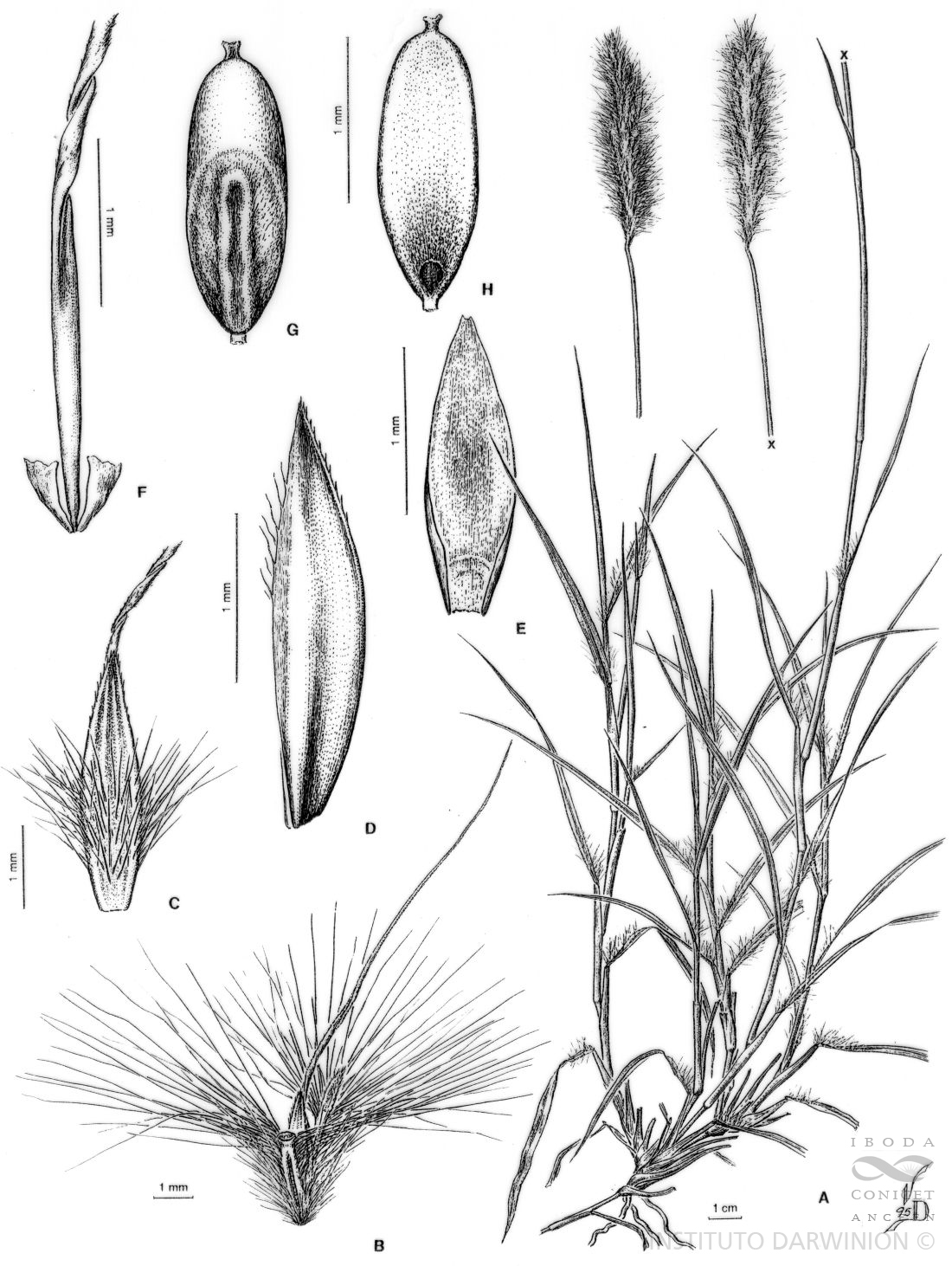 A. Planta. B. Par de espiguillas vista dorsal. C. Gluma inferior vista dorsal. D. Gluma superior vista lateral. E. Lemma inferior vista interna. F. Lodículas y base de la arista. G. Cariopsis, vista escutelar. H. Cariopsis, vista hilar.