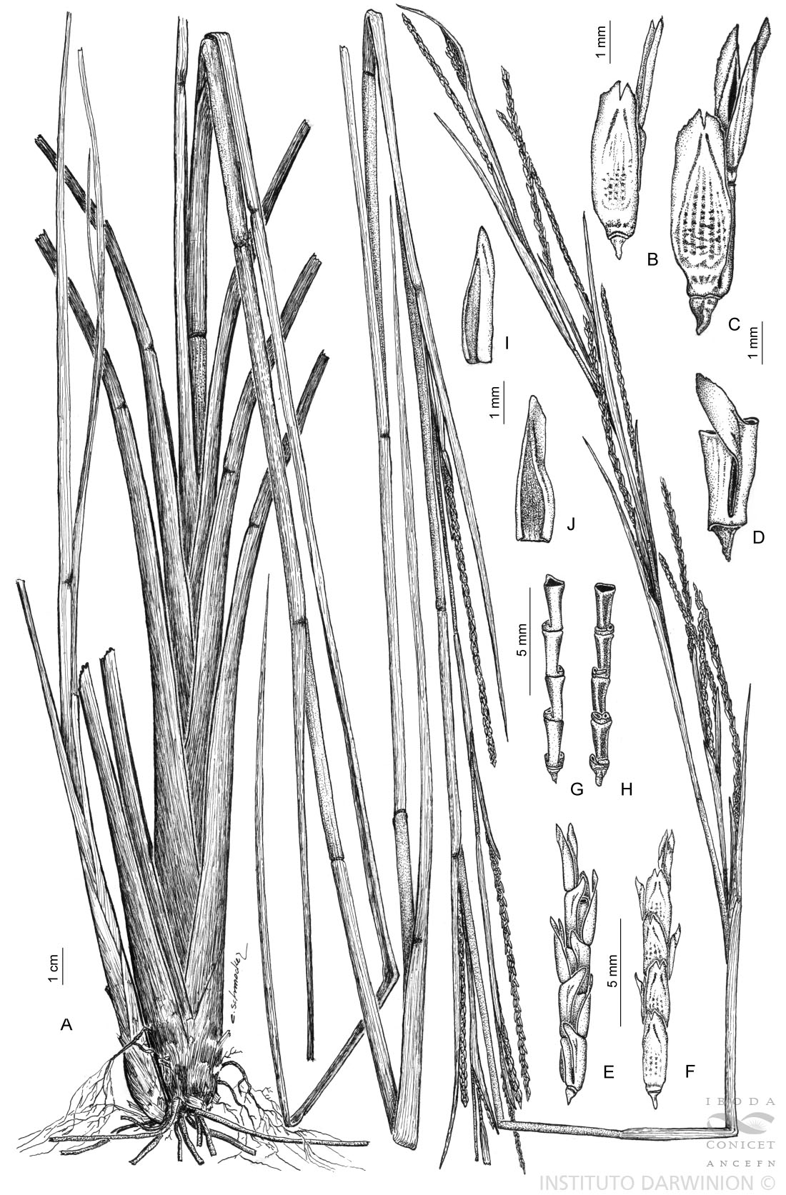 A. Planta. B. Artejo de la parte distal de un racimo con espiguilla pedicelada algo reducida y neutra. C. Artejo de la parte media de un racimo con espiguilla sésil (abajo a la izquierda), pedicelo (abajo a la derecha) y espiguilla pedicelada (arriba a la derecha). D. Conjunto de artejos y pedicelo auriculado. E. Porción de un racimo con 4 artejos y espiguilla, vista frontal. F. Ídem, vista dorsal. G. Gluma superior de la espiguilla pedicelada, vista ventral. H. Gluma inferior de la espiguilla