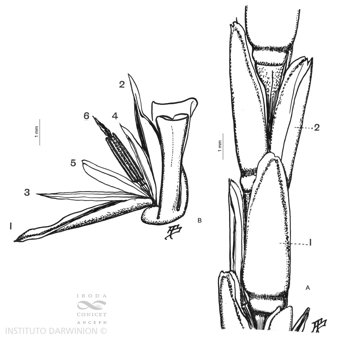 A, trozo de espiga, 1, espiguilla sésil hermafrodita, 2, espiguilla pedicelada del par, tambien hermafrodita; B, trozo de raquis con espiguilla sésil abierta,para mostrar sus partes, 1, gluma II; 3, lemma estéril, 4, lemma fértil, 5, pálea fértil, 6, flor hermafrodita antes de la antesis.