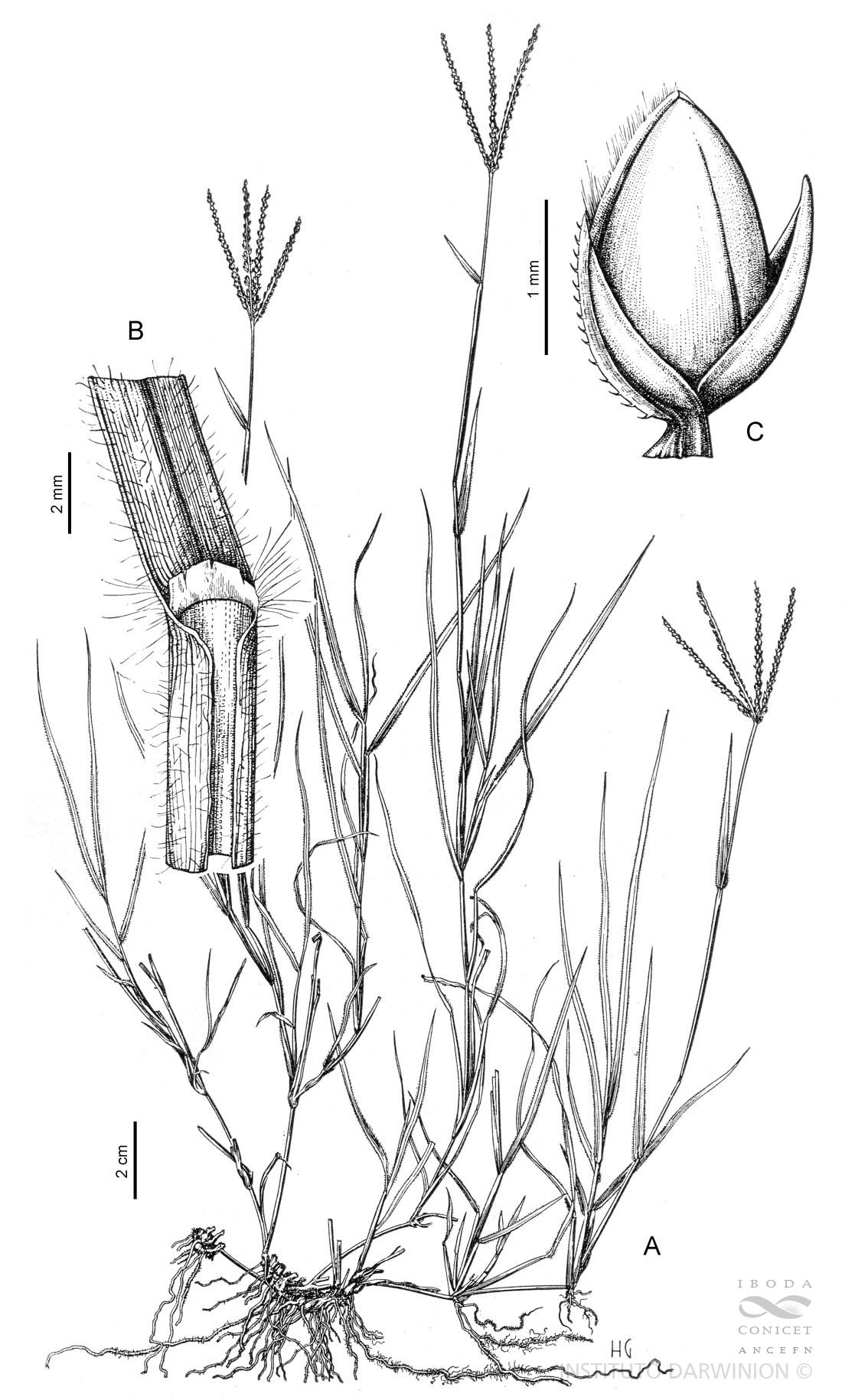 Plantas perennes, rastreras, estoloníferas, radicantes en los nudos inferiores; cañas floríferas más o menos erguidas de 15-40 cm de alto; vainas glabras a hirsutas; lígulas membranáceas, ca. 1 mm de largo, pilosas en la cara abaxial, el ápice fimbriado; láminas lineares, de 0,5-10 cm x 2-4 mm, planas, glabras a hirsutas; prefoliación convoluta. Inflorescencias formadas por 2-5 racimos unilaterales, digitados; raquis de los racimos de 1-5 cm de largo, aplanado, cortamente alado. Espiguillas anchamente elipsoides, de 2-3(-3,5) mm de largo, 1-2-floras, raquilla prolongada o ausente; glumas generalmente desiguales, la inferior 1-nervia, la superior 1-3-nervia, de ápice mútico; lemma tan larga como la espiguilla, lisa, pajiza, comprimida lateralmente, carenada, con la carena brevemente alada y ciliolada; pálea de similar consistencia que la lemma, 2-nervada, escabriúscula; cariopsis elipsoidea, de 1-1,5 mm de largo, comprimida lateralmente, castaña.