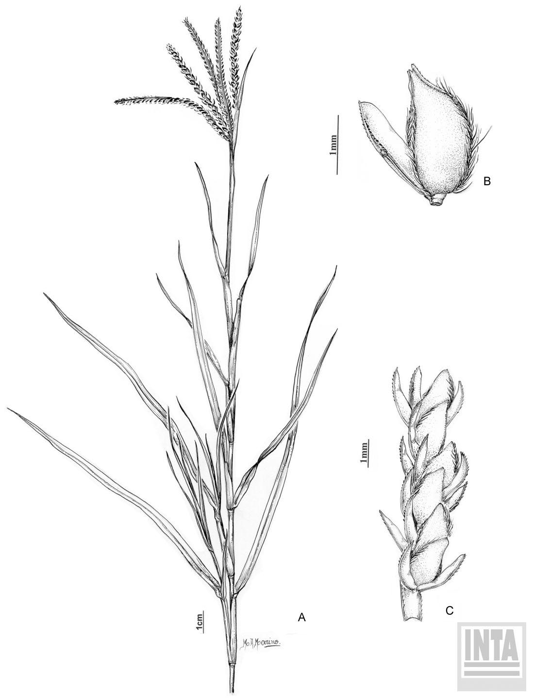 Plantas perennes, rastreras, estoloníferas, radicantes en los nudos inferiores; cañas floríferas erguidas hasta de 45 cm de alto; vainas glabras (a excepción de la región ligular que presenta pelos largos); lígulas membranáceo-ciliadas hasta de 0,5 mm de largo; láminas lineares, de 1,5-10 cm x 2-4 mm, planas, convolutas o involutas, glabras, raramente con algunos pelos laxos; prefoliación convoluta. Inflorescencias formadas por 4-6 racimos unilaterales, digitados; raquis de los racimos de 2-7,5 cm de largo, triquetro. Espiguillas elipsoides, de 2-3 mm de largo; 1-floras; glumas generalmente iguales o desiguales en longitud, 1-nervias, la inferior desde ½ hasta ca. la longitud del antecio, la superior desde ½ hasta superando la longitud del mismo, de ápice mútico; lemma tan larga como la espiguilla, lisa, pajiza, comprimida lateralmente, carenada, carena conspicuamente ciliolada y generalmente también los bordes, mucronulada en el ápice; pálea de similar consistencia que la lemma, 2-nervia, glabra; raquilla prolongada, setiforme; cariopsis elipsoidea, comprimida lateralmente, castaña, ca. 1,2 mm de largo.