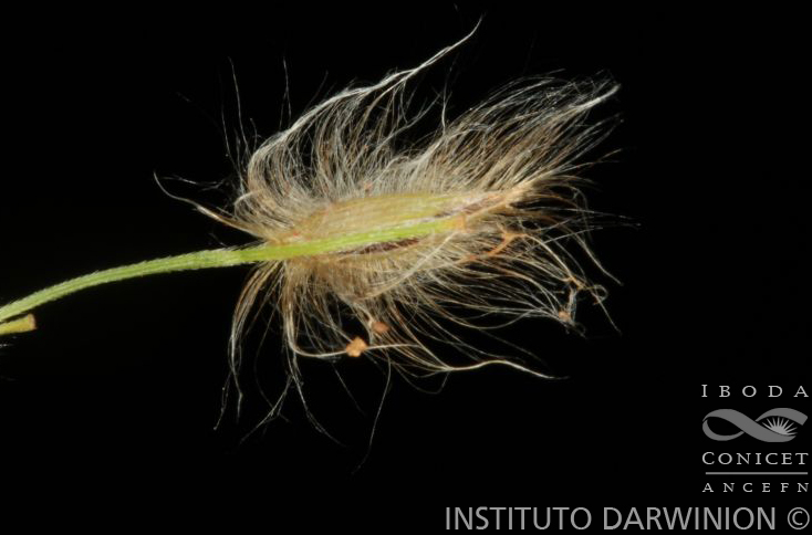 Plantas perennes de 80-250 cm de alto, cespitosas, rizomas abultados cubiertos por catáfilos pubescentes; cañas de 5-10 mm de diámetro, robustas, erectas; nudos castaños, pilosos; vainas de 8-30 cm x 7-10 mm, las inferiores laxamente hirsutas y las superiores glabrescentes; zona ligular glabra; lígulas de 2-4 mm de largo, triangulares, membranáceas; láminas de 15-32 x 1-2 cm, planas, escabrosas, estrigosas o glabras. Panícula laxa de 20-40 cm de largo con 20-50 racimos, ocasionalmente menos de 20; raquis triquetro, escabroso; pedicelos de 1-3,5 mm de largo, escabrosos. Espiguillas de (3,7-)4-4,5 x 0,8-0,9 mm, angostamente elipsoides con ápice acuminado, dispuestas en grupos de 2, con pelos lanosos y ocráceos de hasta 6 mm de largo excediendo el largo de las espiguillas; gluma inferior de 0,5-1 mm de largo, membranácea, generalmente triangular; gluma superior de 3,4-4 mm de largo, 3-nervia, lanceolada, pilosa en zonas marginales e internerviales; lemma inferior de (3,7-)4-4,5 mm de largo, 7-nervia, lanceolada, acuminada, glabra a ambos lados del nervio medio y alternadamente pilosa y glabra en las zonas restantes; pálea inferior reducida, membranácea; lodículas de la flor inferior presentes o ausentes; antecio superior de 3,8-4 x 0,7-0,8 mm, angostamente elipsoide, ápice acuminado, castaño; lodículas de 0,5 mm de largo; anteras de 0,7-1 mm de largo, purpúreas; estigmas purpúreos; cariopsis de 1,5-2 mm de largo; hilo aovado; embrión ½ de la longitud total de la cariopsis.